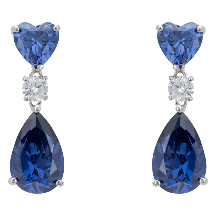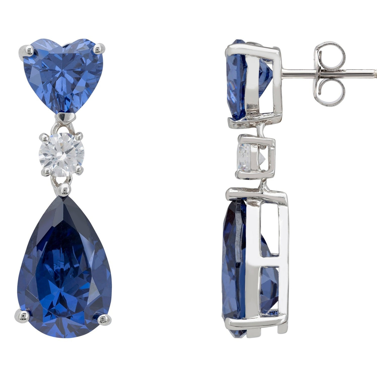 These earrings are handcrafted from 925 sterling silver. They feature lab-grown tanzanite gemstones in a pear and heart shape and simulated diamonds.