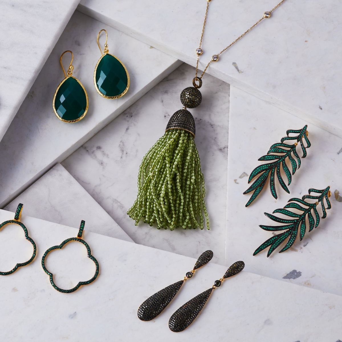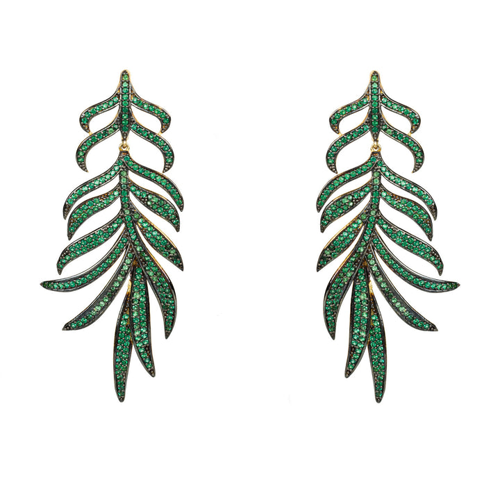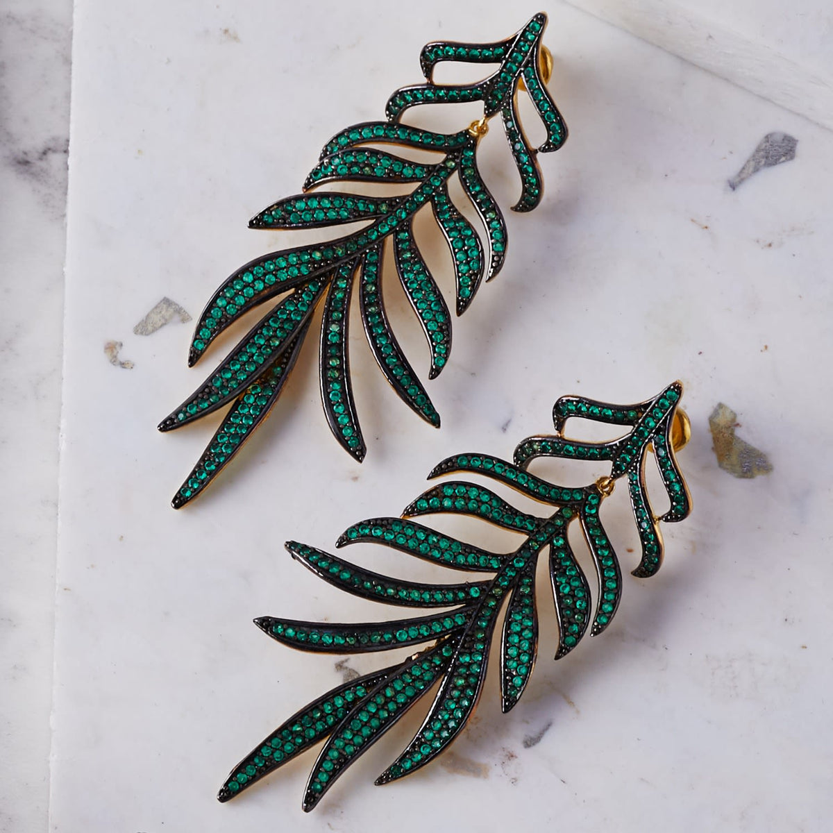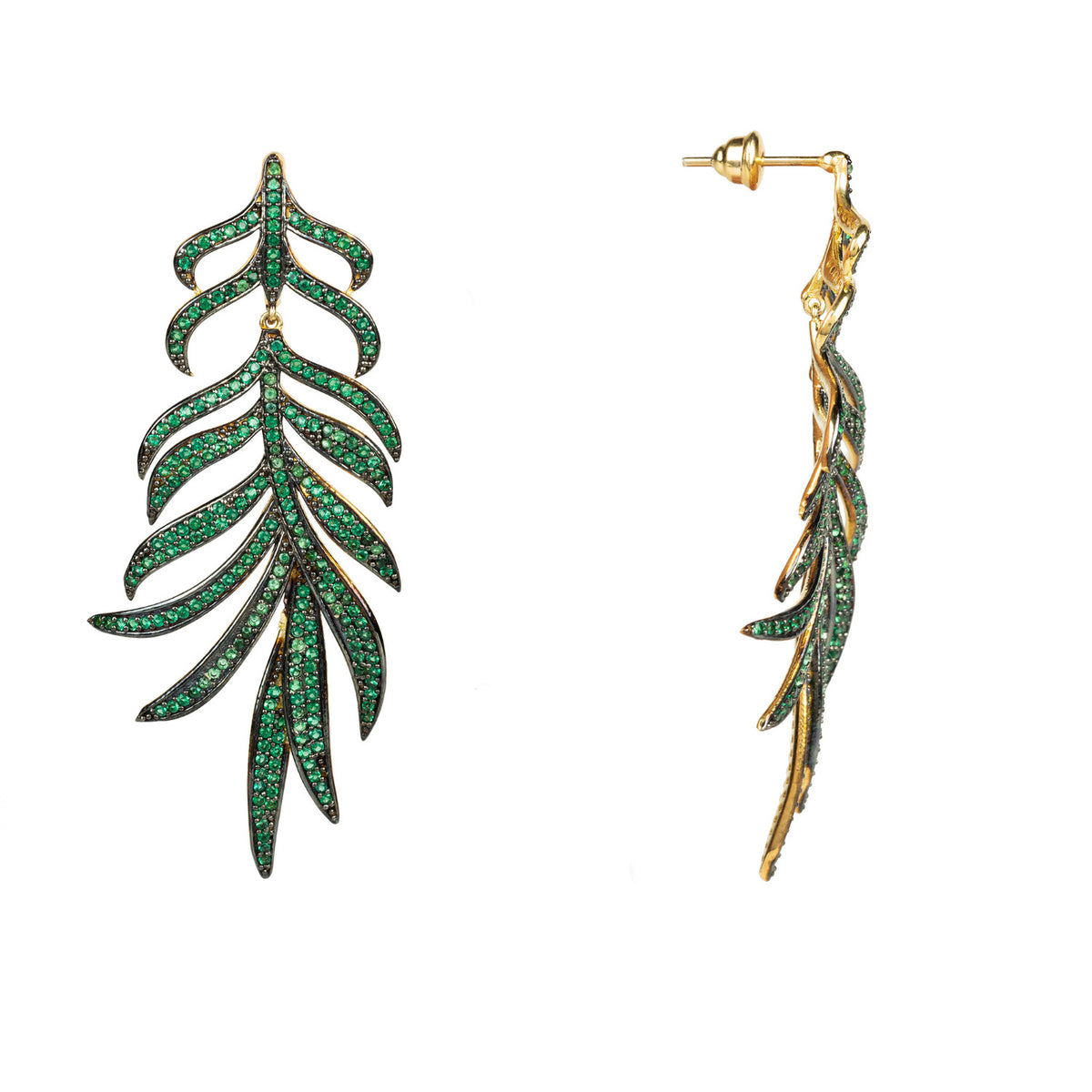 The Feathered Leaf Statement Drop Earrings Green Cz by Latelita are a nature-inspired accessory. These earrings dazzle with rows of sparkling green zircons beautifully set within a leaf-shaped design. Made with 925 sterling silver and dipped in 18ct gold, they are perfect for a bridal, evening, or cocktail party outfit, offering natural movement and a light, comfortable feel.