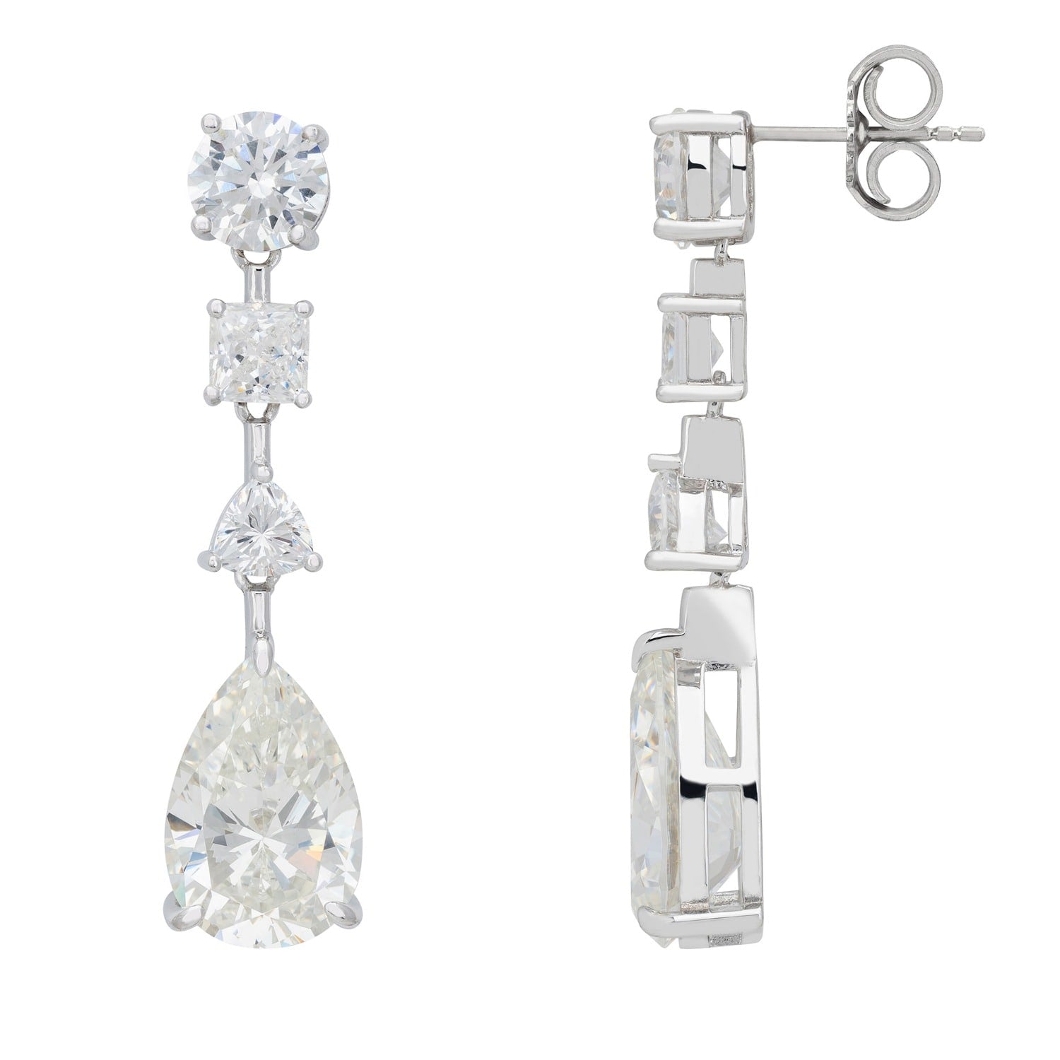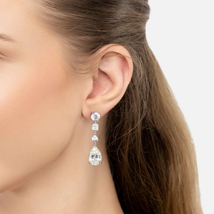 These drop earrings are handcrafted from 925 sterling silver dipped in rhodium. They feature lab-grown teardrop moissanite and simulated diamonds.