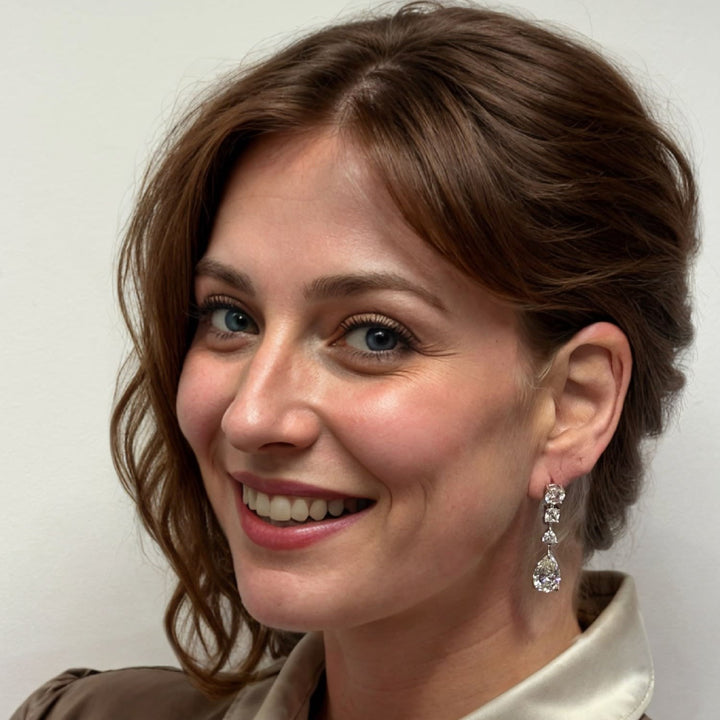 The Pompadour Moissanite Drop Earrings Silver by Latelita are an exquisite statement of glamour. They feature lab-grown teardrop moissanite gemstones, known as a symbol of brilliance and eternal love. Suspended below a cascade of three simulated diamonds, these earrings capture light from every angle. Handcrafted in 925 sterling silver dipped in rhodium, they are a stunning and ethical alternative to diamonds.