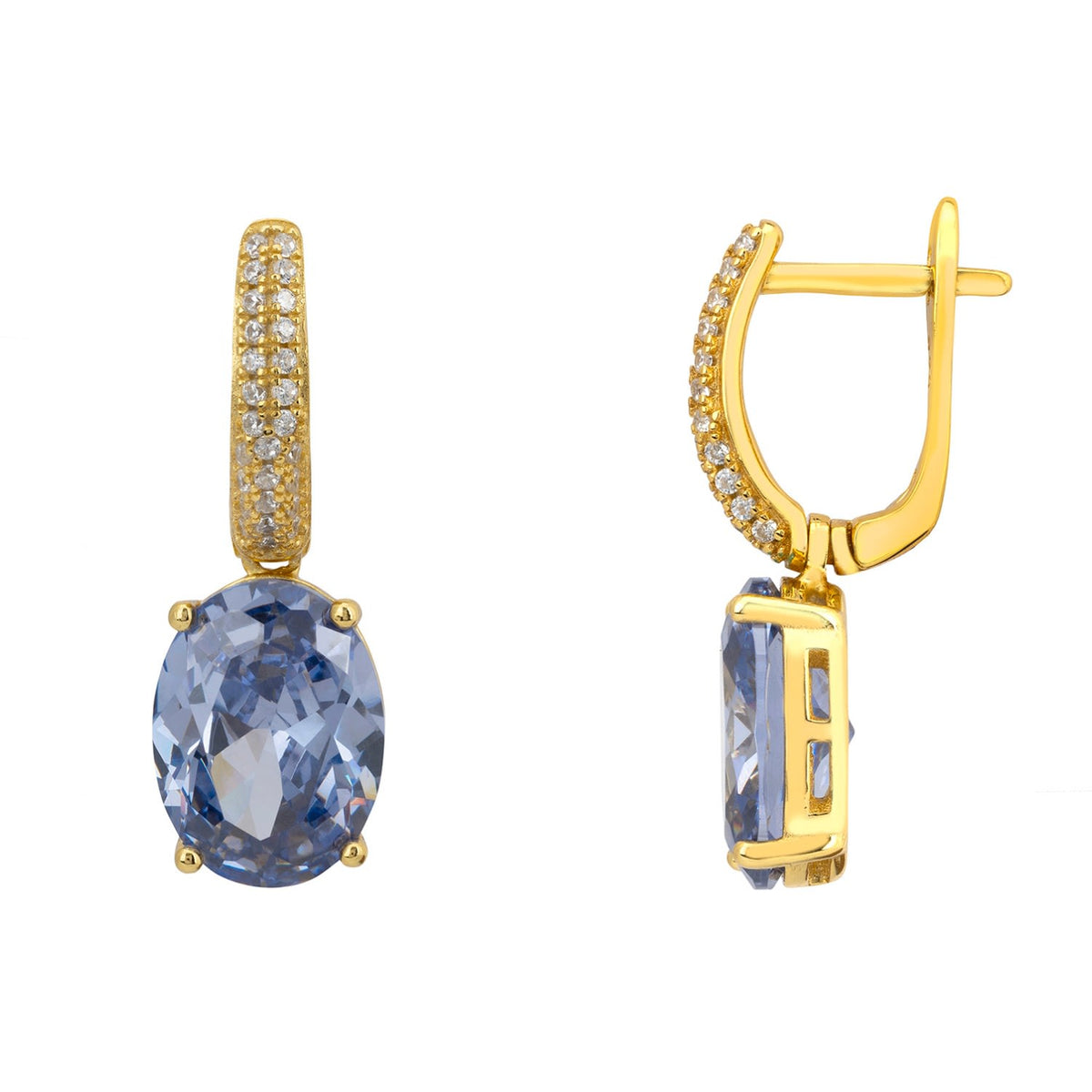 These drop earrings are handcrafted from 925 sterling silver dipped in 18ct gold. They feature lab-grown tanzanite gemstones, simulated diamonds, and cubic zirconia.