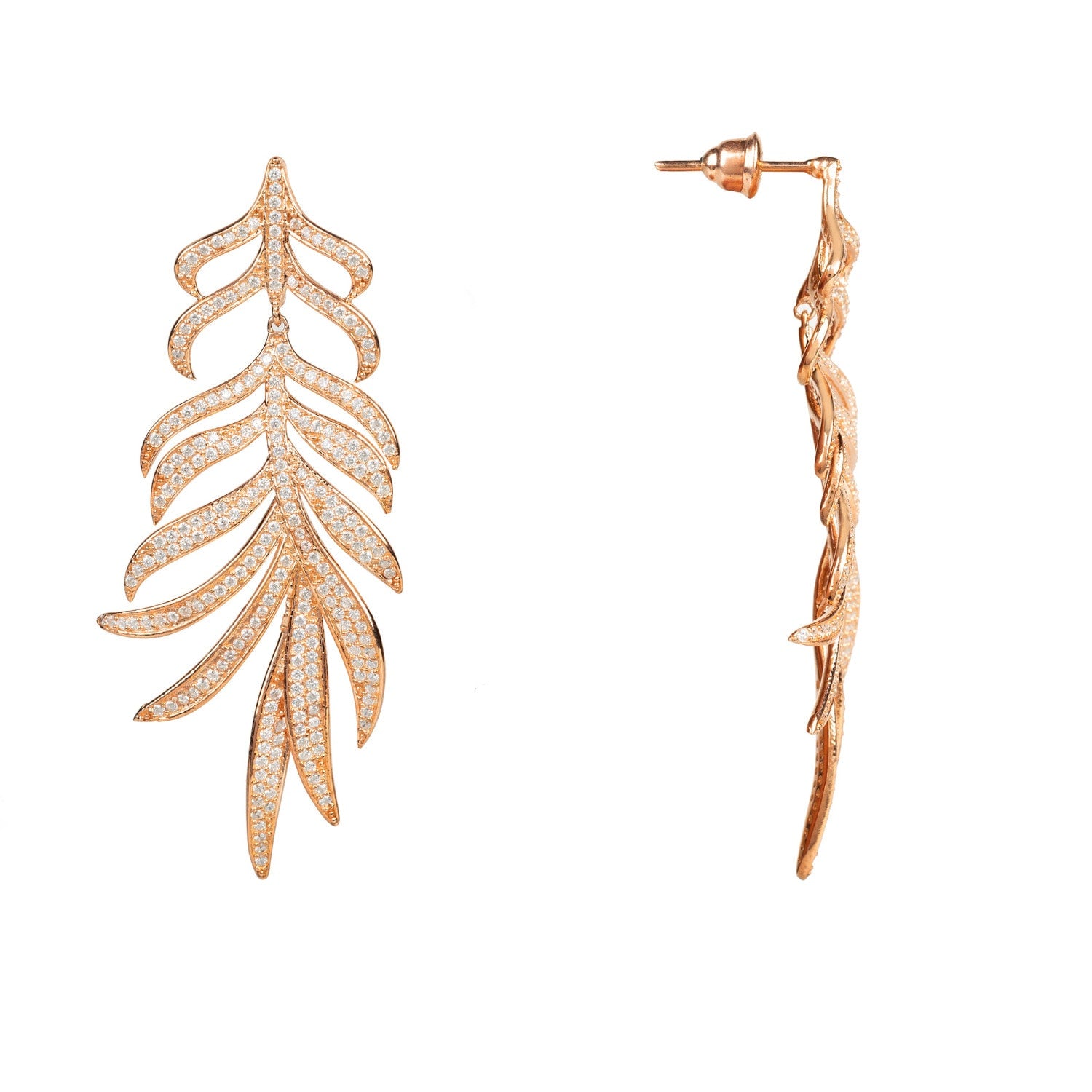 The Feathered Leaf Statement Drop Earrings Rosegold by Latelita are a nature-inspired accessory. These earrings dazzle with rows of sparkling white zircons beautifully set within a feathered leaf-shaped design. Made with 925 sterling silver and dipped in 18ct rose gold, they are perfect for a bridal, evening, or cocktail party outfit, offering natural movement and a light, comfortable feel.