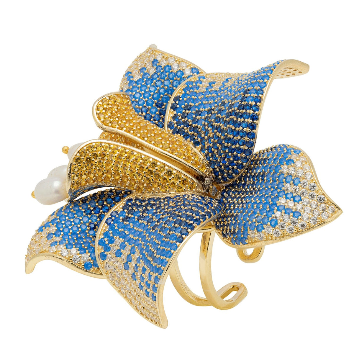 The Daffodil With Pearls Cocktail Ring by Latelita is a bold and radiant statement piece. The exquisite daffodil design is set with sapphire blue, yellow, and white cubic zirconia, with three small pearls at its center. As daffodils symbolize new beginnings, hope, and joy, this ring is not only a beautiful accessory but also a meaningful talisman that will make you stand out from the crowd.