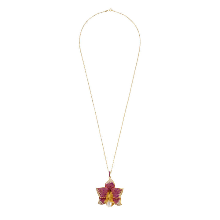This necklace is handcrafted from 925 sterling silver and dipped in 18-karat gold. It features a pearl and cubic zirconia in ruby pink, yellow, and white.
