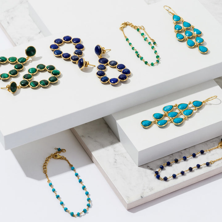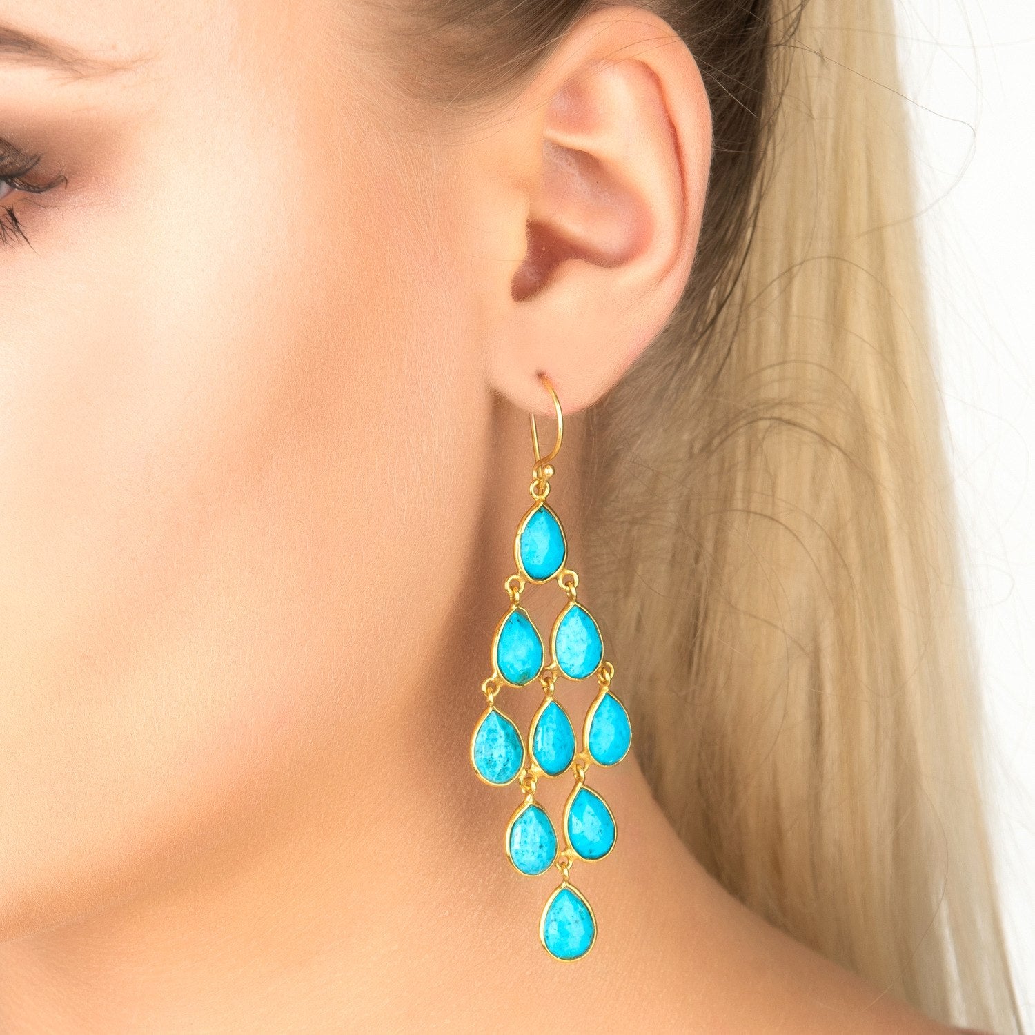 The Erviola Gemstone Cascade Earrings by Latelita are a perfect statement piece that is light to wear. They feature nine linked teardrop-shaped turquoise gemstones that hang from a polished metal french hook. The natural movement of the earrings catches everyone's eye, making them extremely versatile for both bohemian daytime looks and demure evening aesthetics.