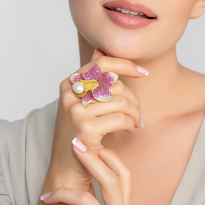 The Daffodil with Pearl Cocktail Ring by Latelita is a statement piece with exquisite style. The ring features a daffodil design adorned with ruby pink, yellow, and white cubic zirconia, with a single pearl inside the flower's trumpet. The daffodil symbolizes new beginnings and good luck, making this ring a beautiful and meaningful accessory for any special occasion.