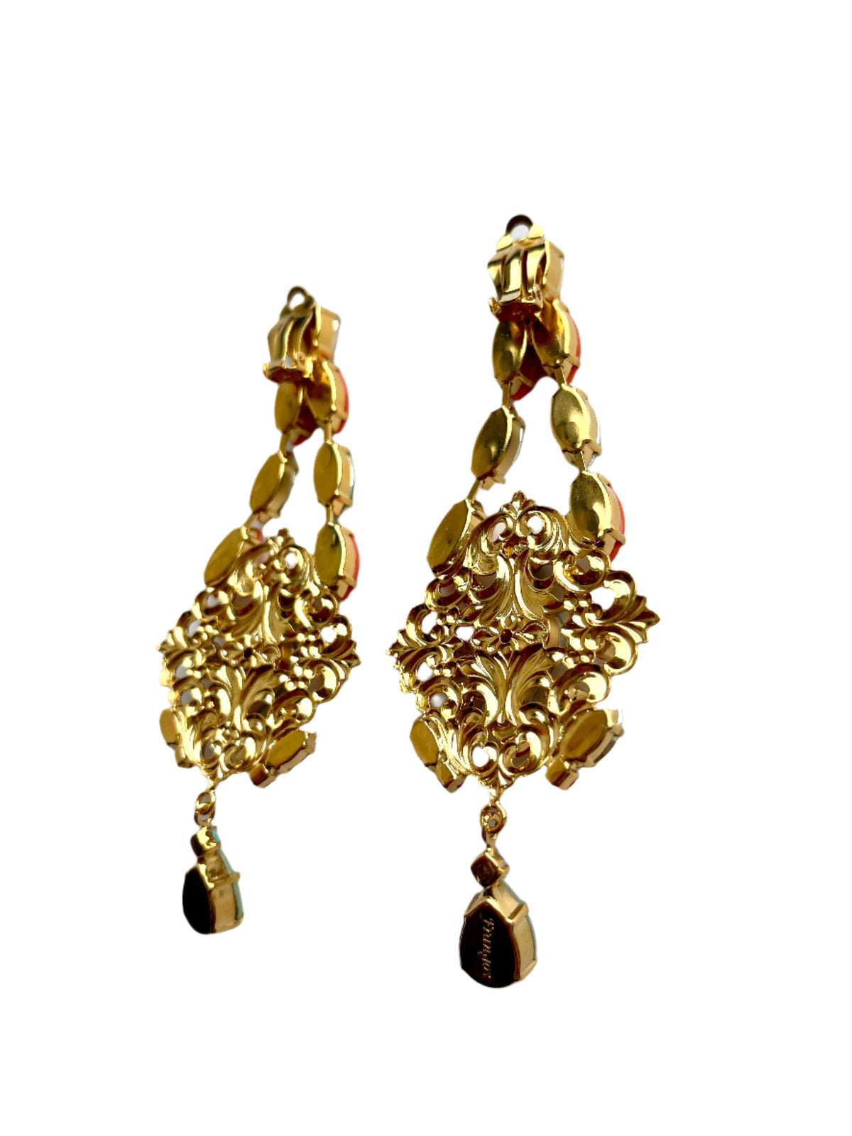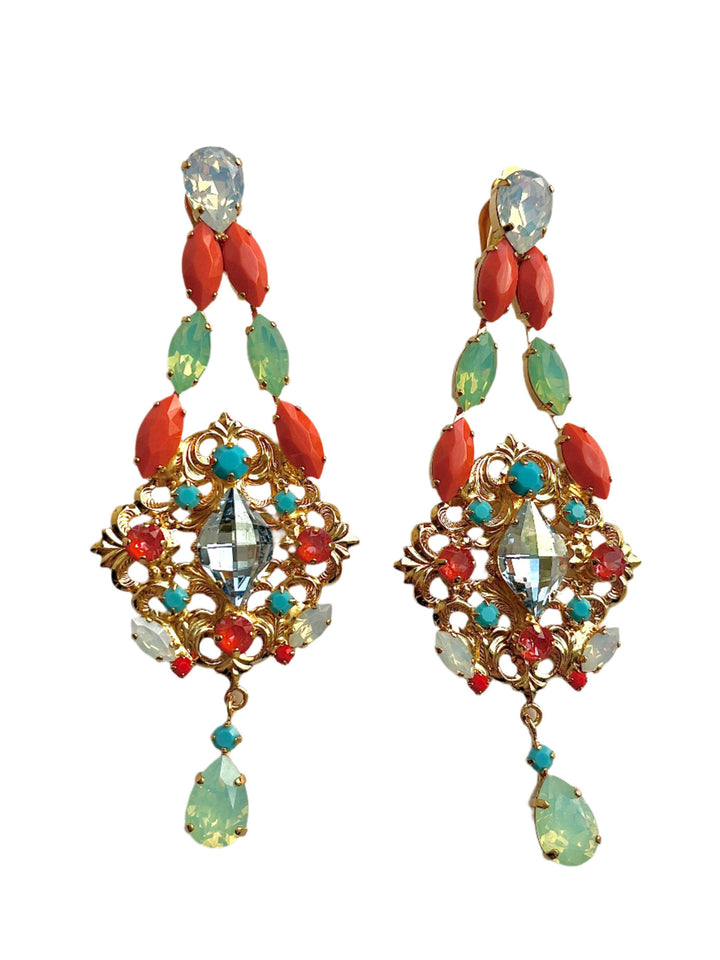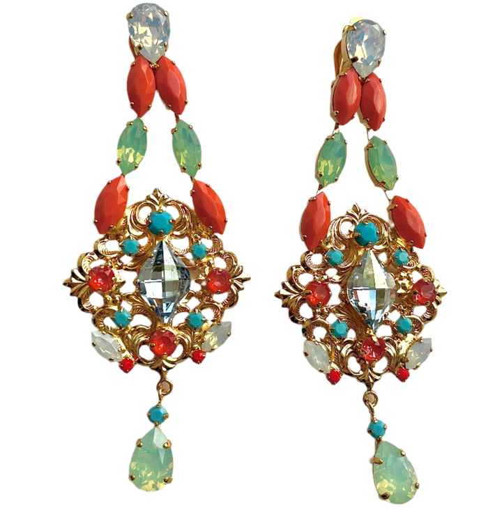 These chandelier earrings are handcrafted with gold filagree and coral, light blue, and turquoise crystals. They are designed with light clip backs.