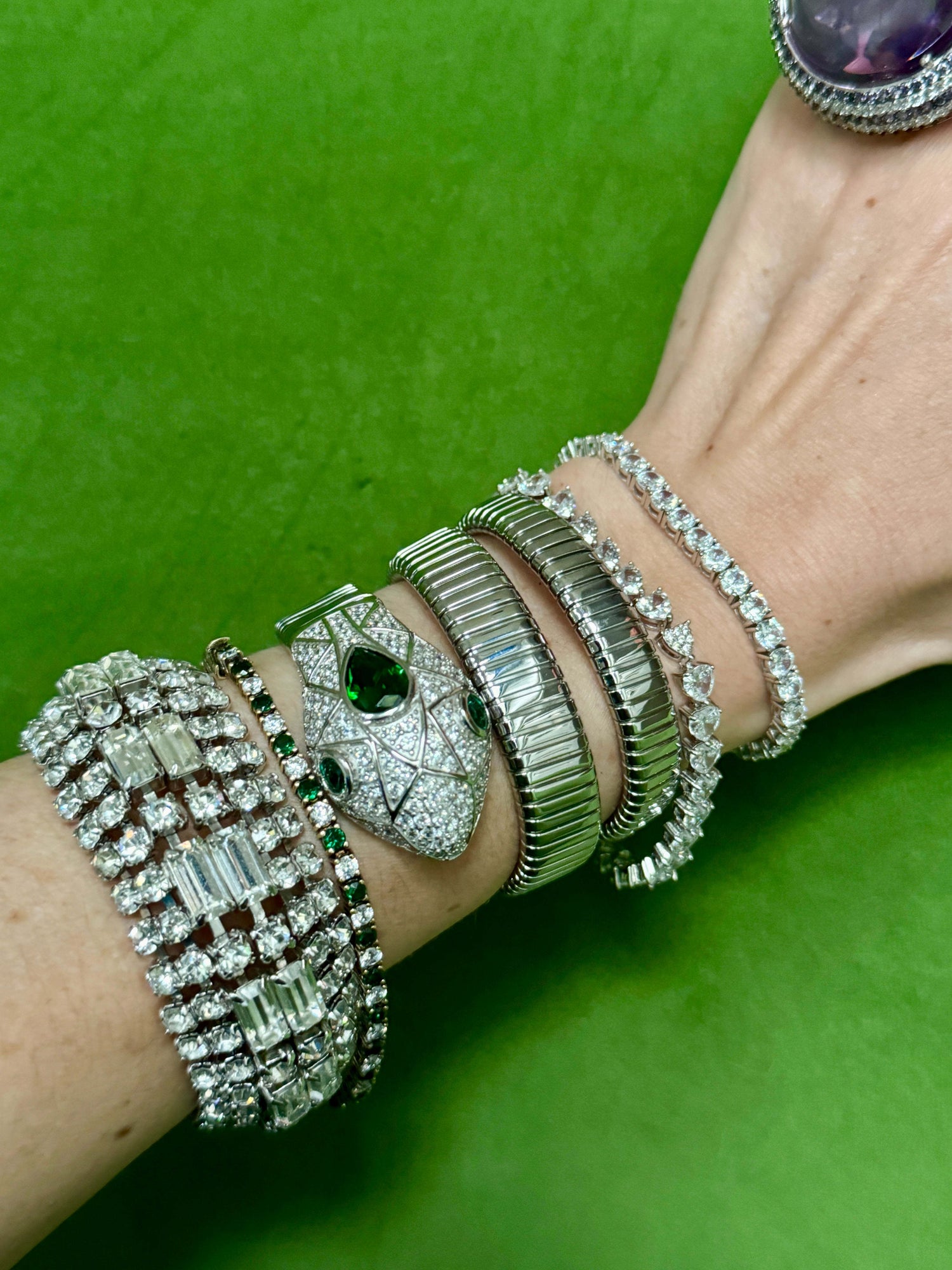 This Emerald Sterling Silver Wrap Snake Bracelet by Laura Gray is a stunning and stylish accessory. The triple-wrap sterling silver snake is adorned with glittering crystals, a striking pear-shaped emerald crystal head, and mesmerizing green crystal eyes. This piece is a perfect addition for those who love snake jewelry.