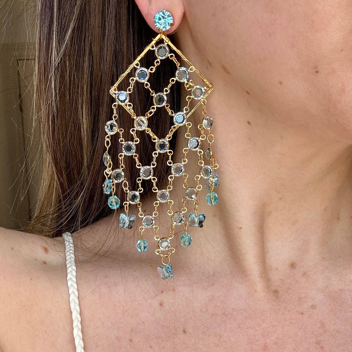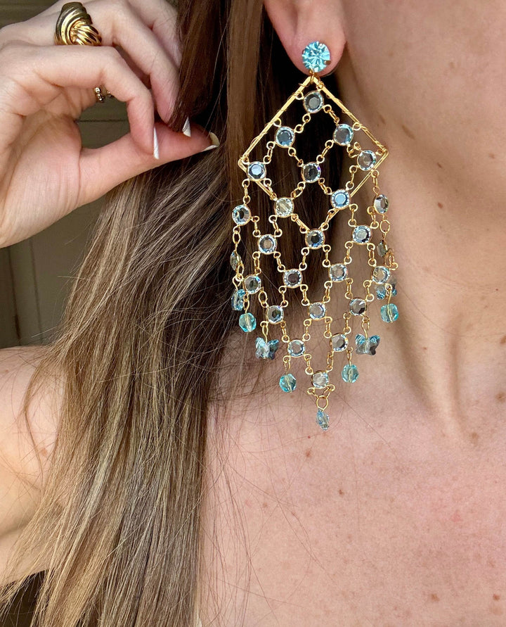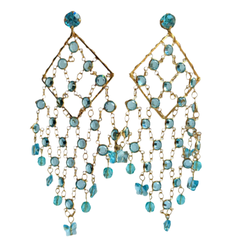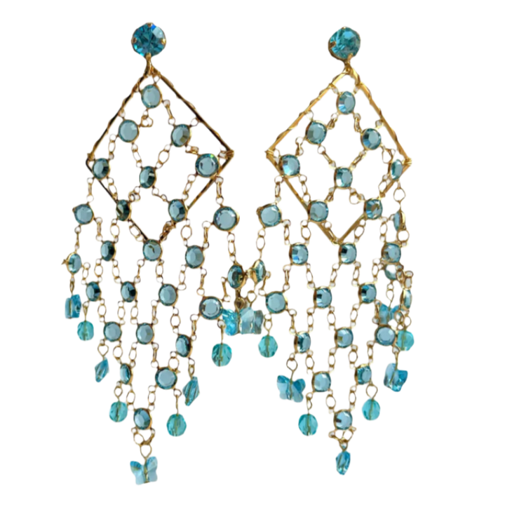 These chandelier earrings are handcrafted from 24k gold plate and Austrian blue crystals.