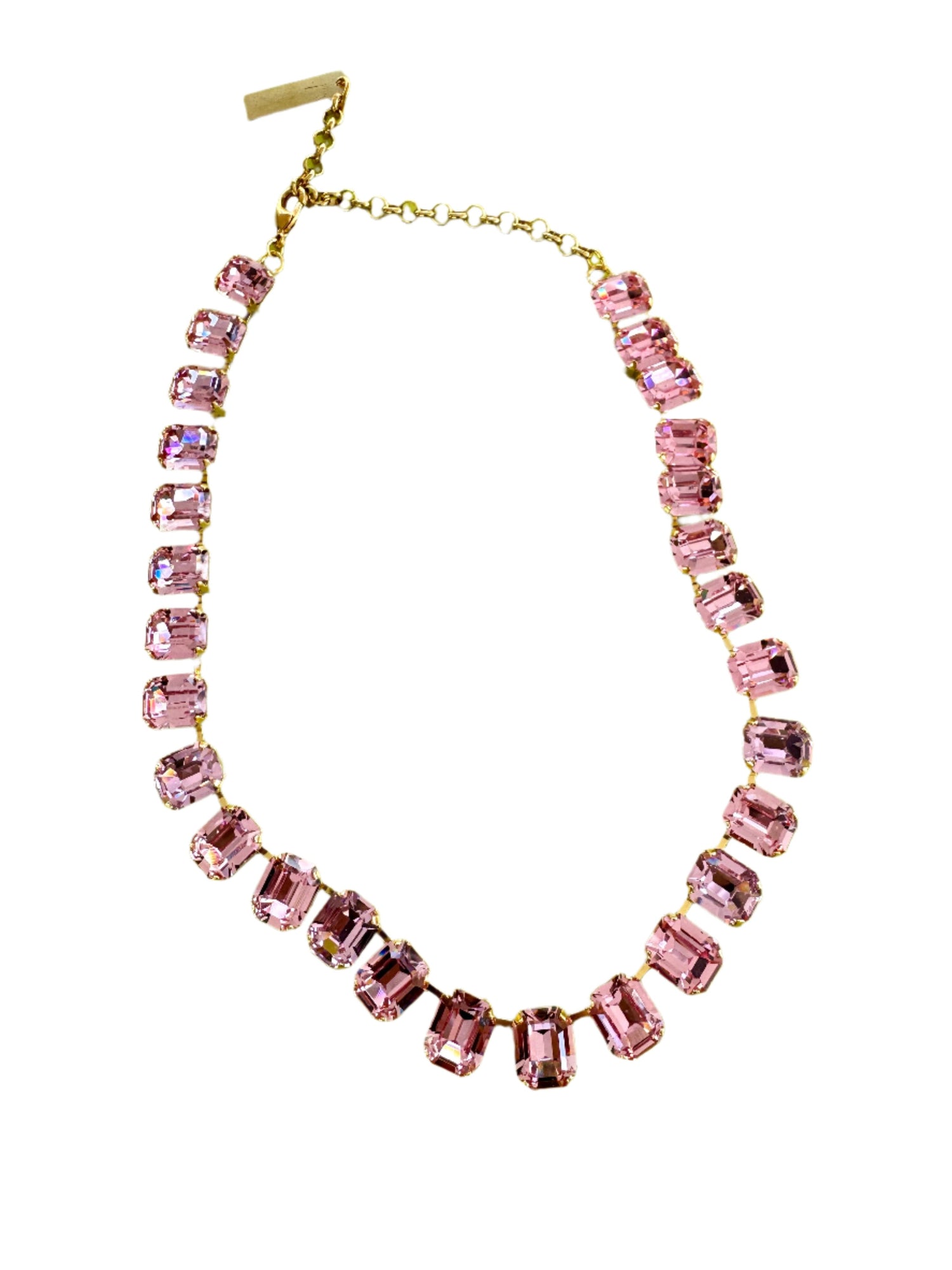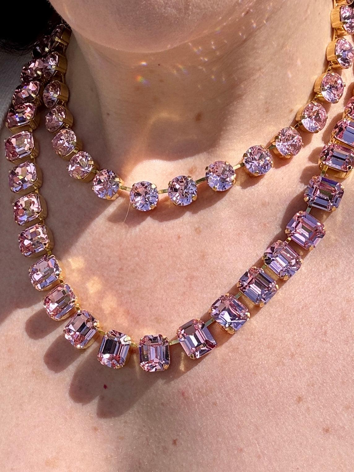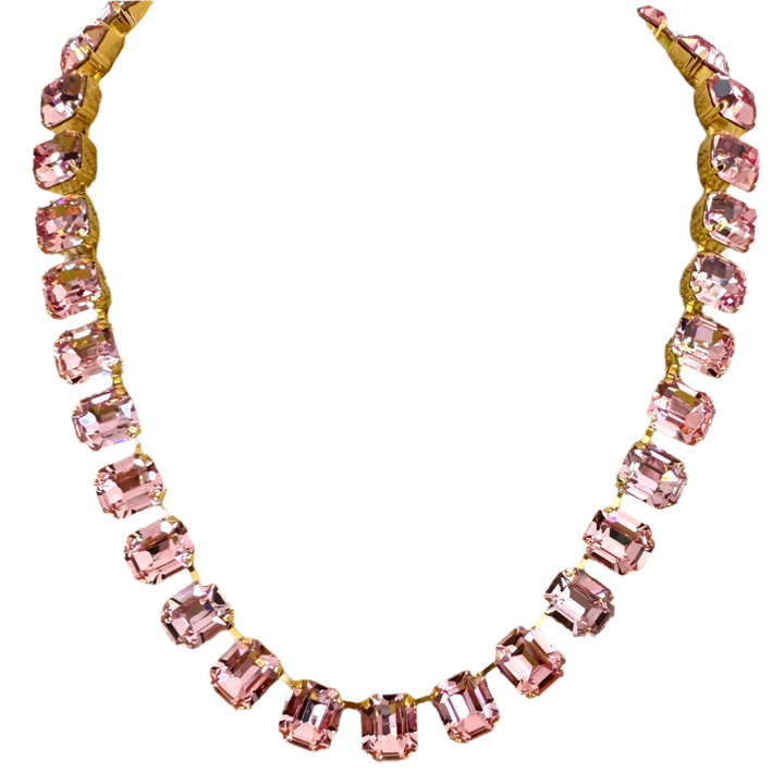 This Light Pink Crystal Square Cut Necklace by Laura Gray is a beautiful and modern choker. It features a larger square-cut crystal, perfect for layering with other necklaces. Handmade from premium materials in Greece, this adjustable necklace is a perfect addition to your crystal collection.