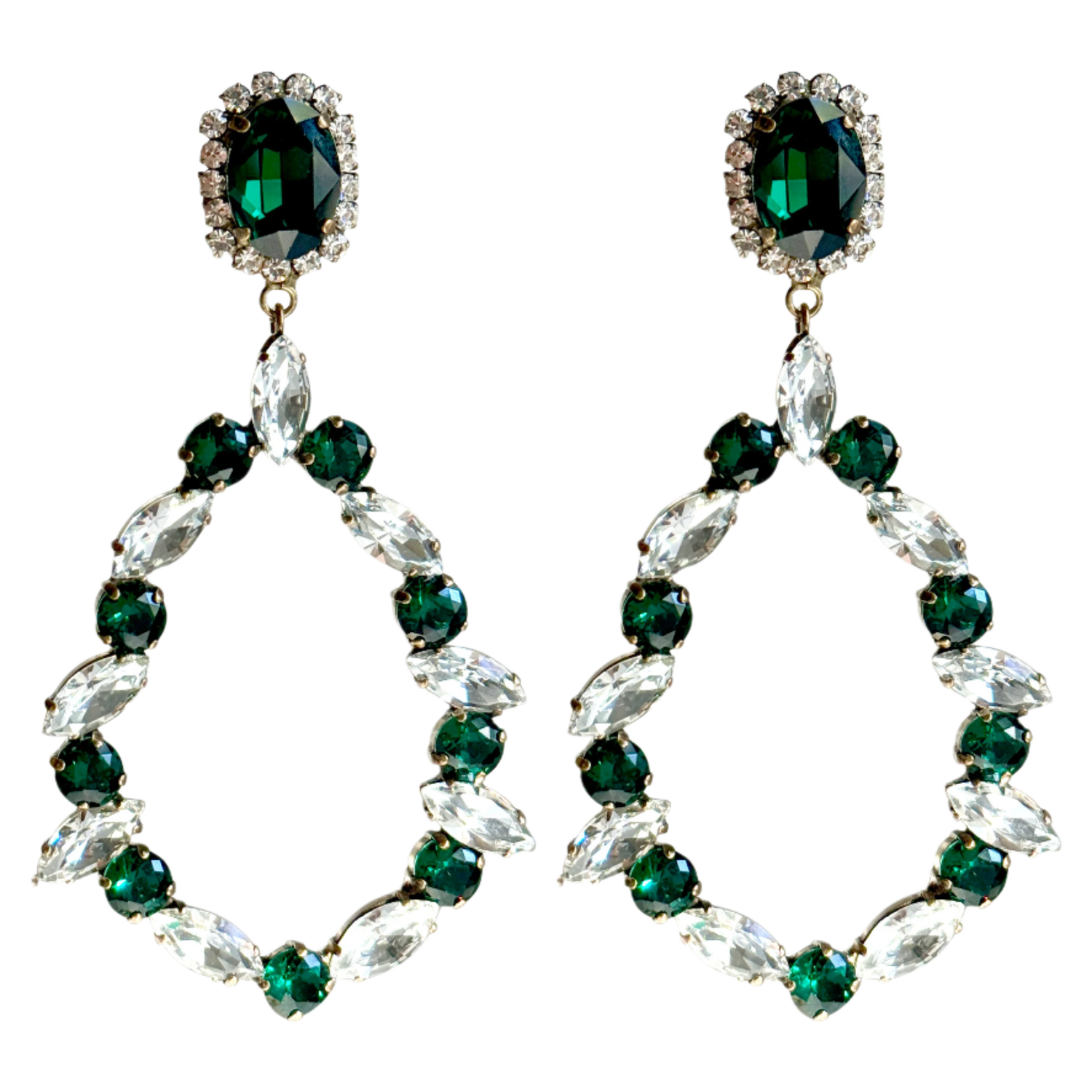 These Emerald Crystal Chandelier Earrings by Laura Gray are a luxurious and glamorous accessory. The earrings are handmade in Athens, Greece, and are crafted from high-end Czech crystal and 24k gold plate. They are lightweight and comfortable to wear all night, and are perfect for a special event or holiday party.
