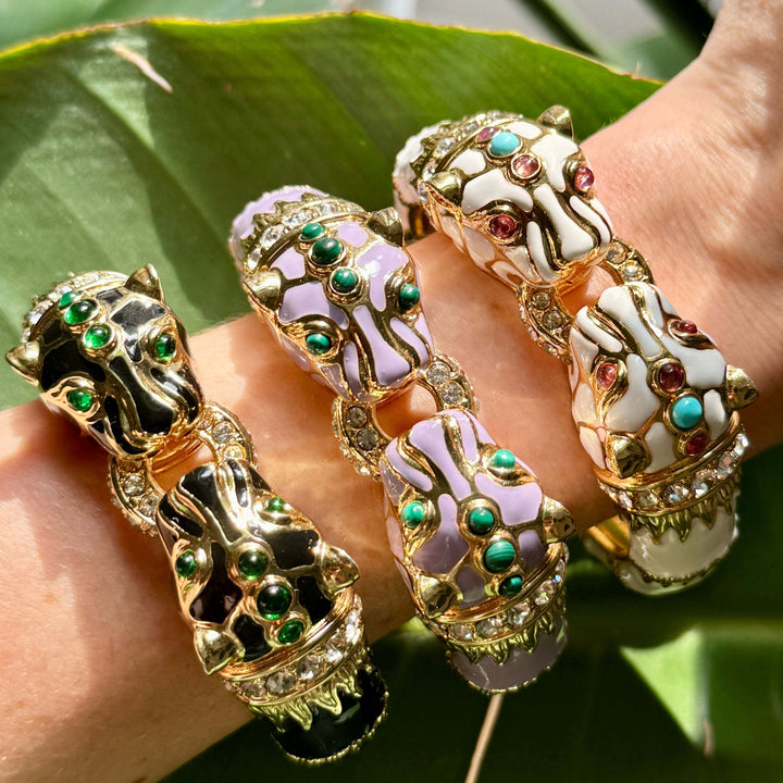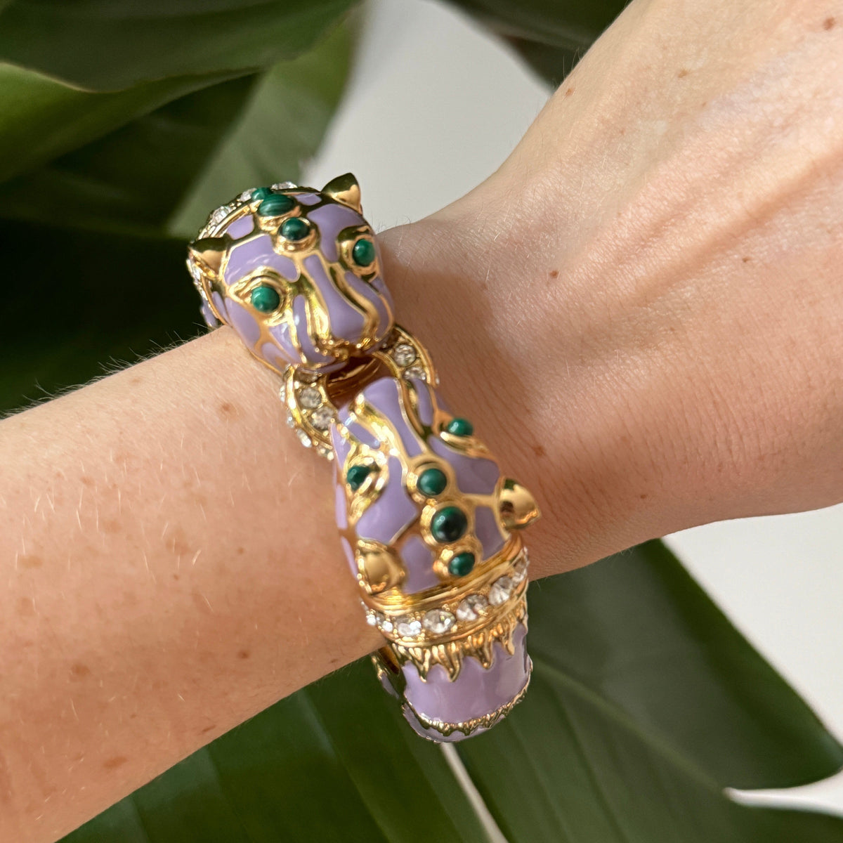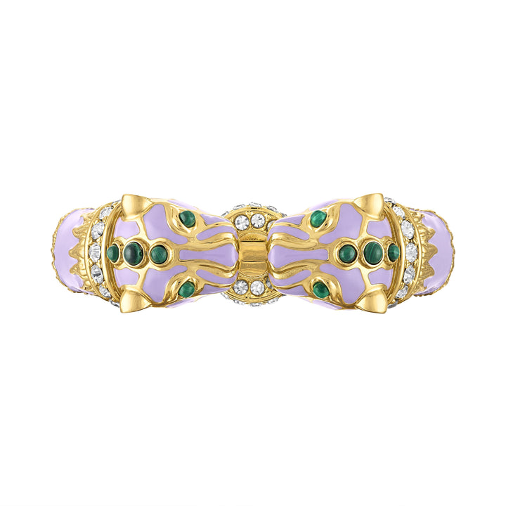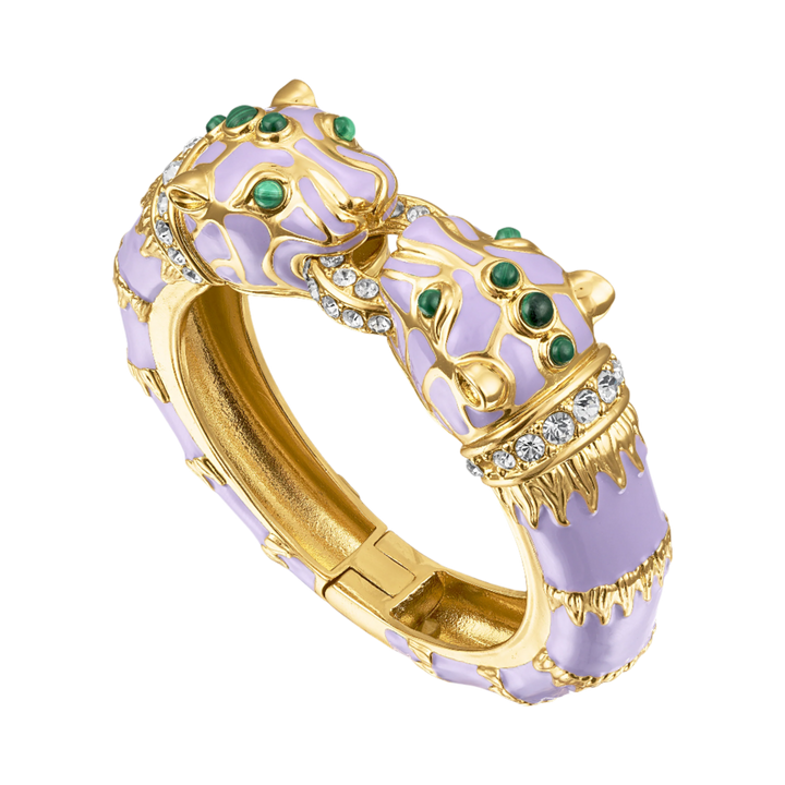 The Lavender Double Panther Bracelet by Laura Gray is a fierce and luxurious accessory. This special limited edition bracelet features genuine malachite cabochons, glossy lavender enamel, 18K gold plate over brass, and glittering crystals. It is part of a vintage-inspired jewelry line that creates luxury jewelry for everyday wear.