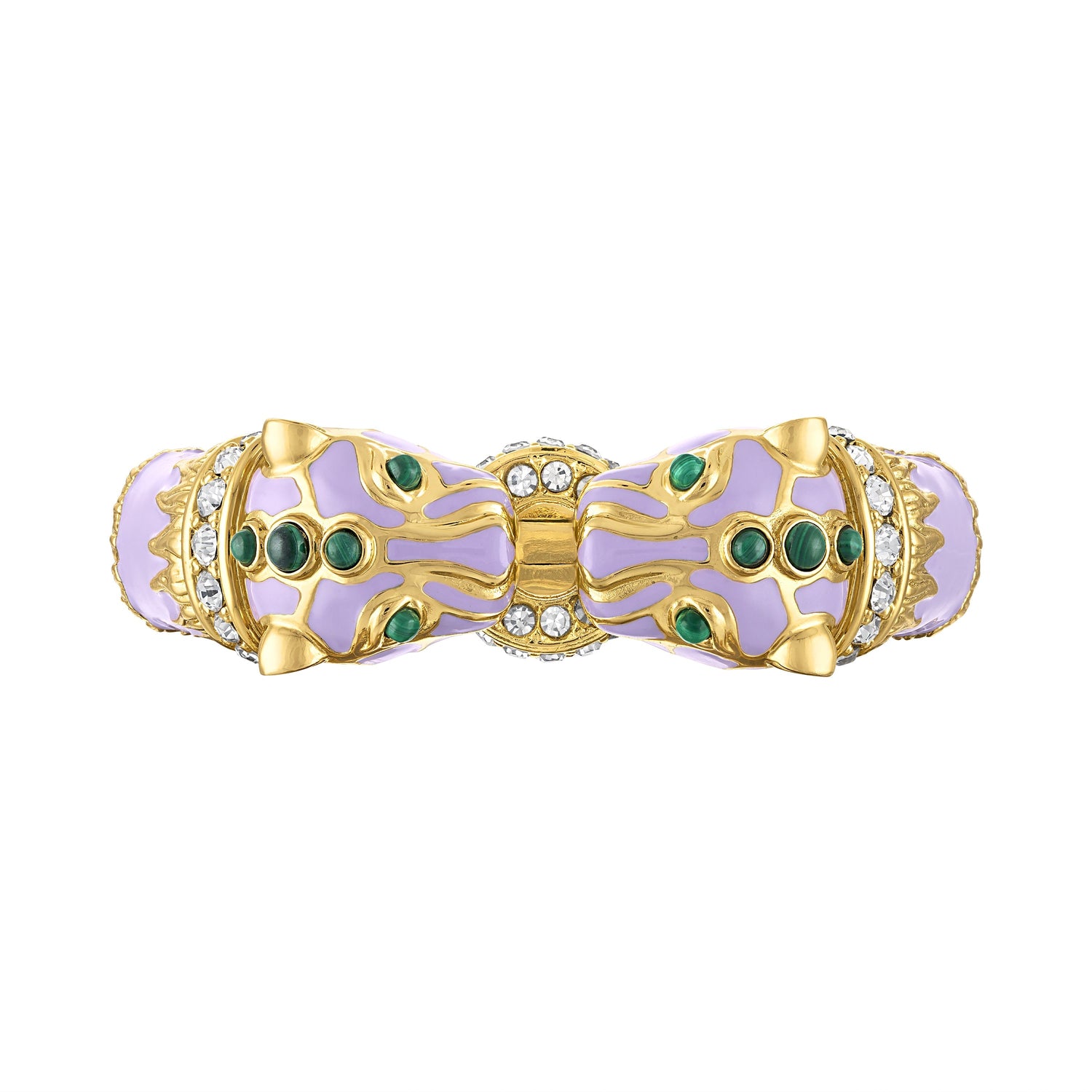 This bangle is crafted with genuine malachite cabochons, glossy lavender enamel, 18K gold plate over brass, and glittering crystals. To open it, gently press on the inside hallmark. Gently clean it with a microfiber cloth.