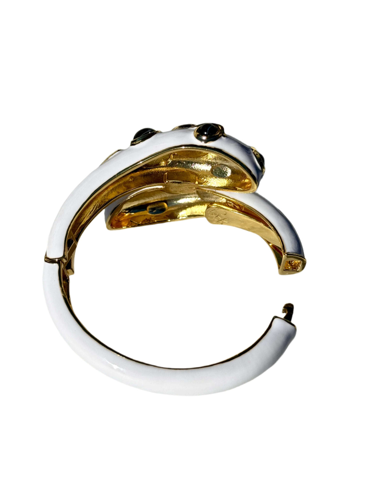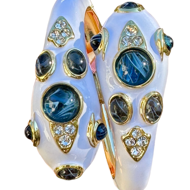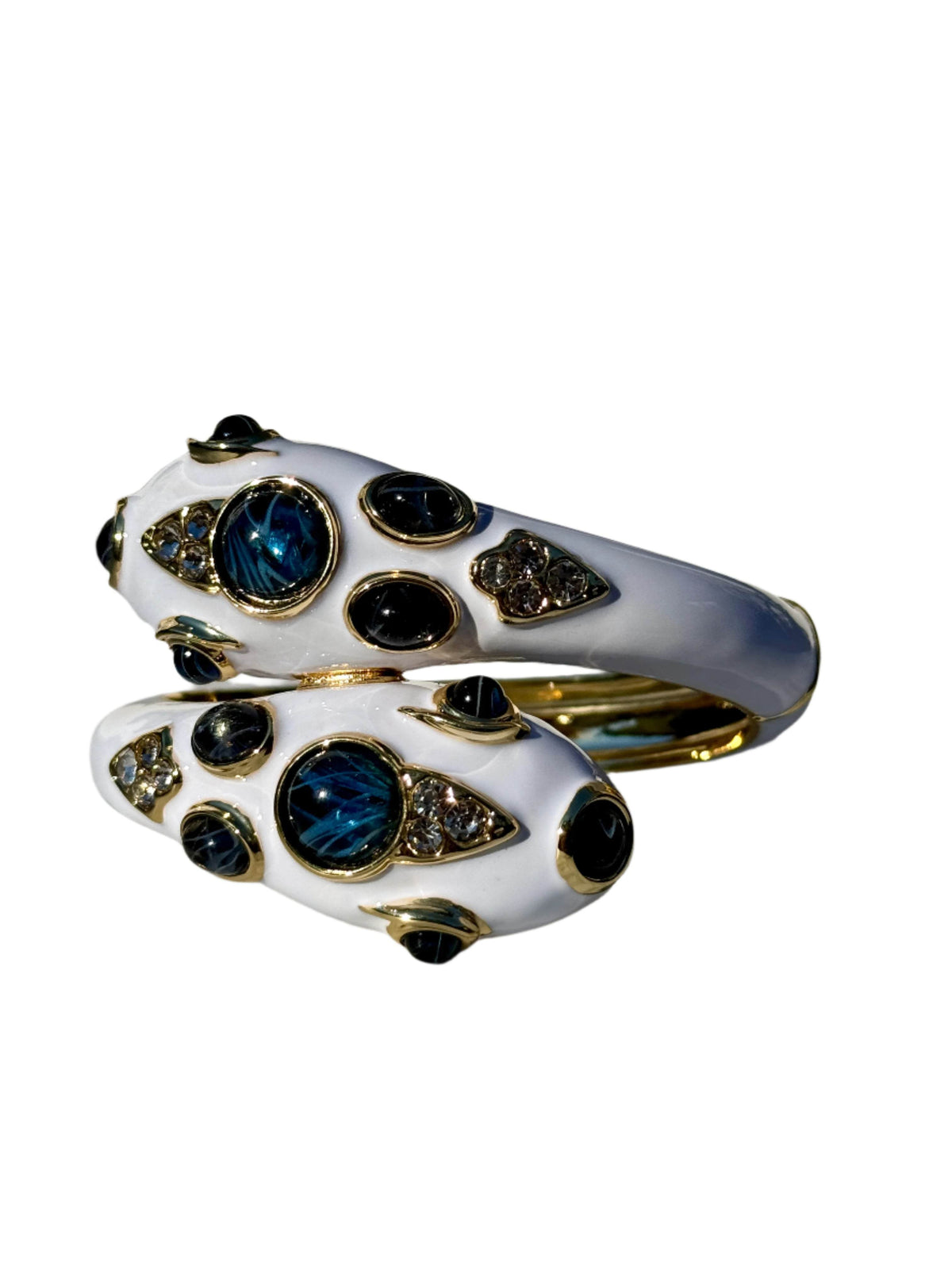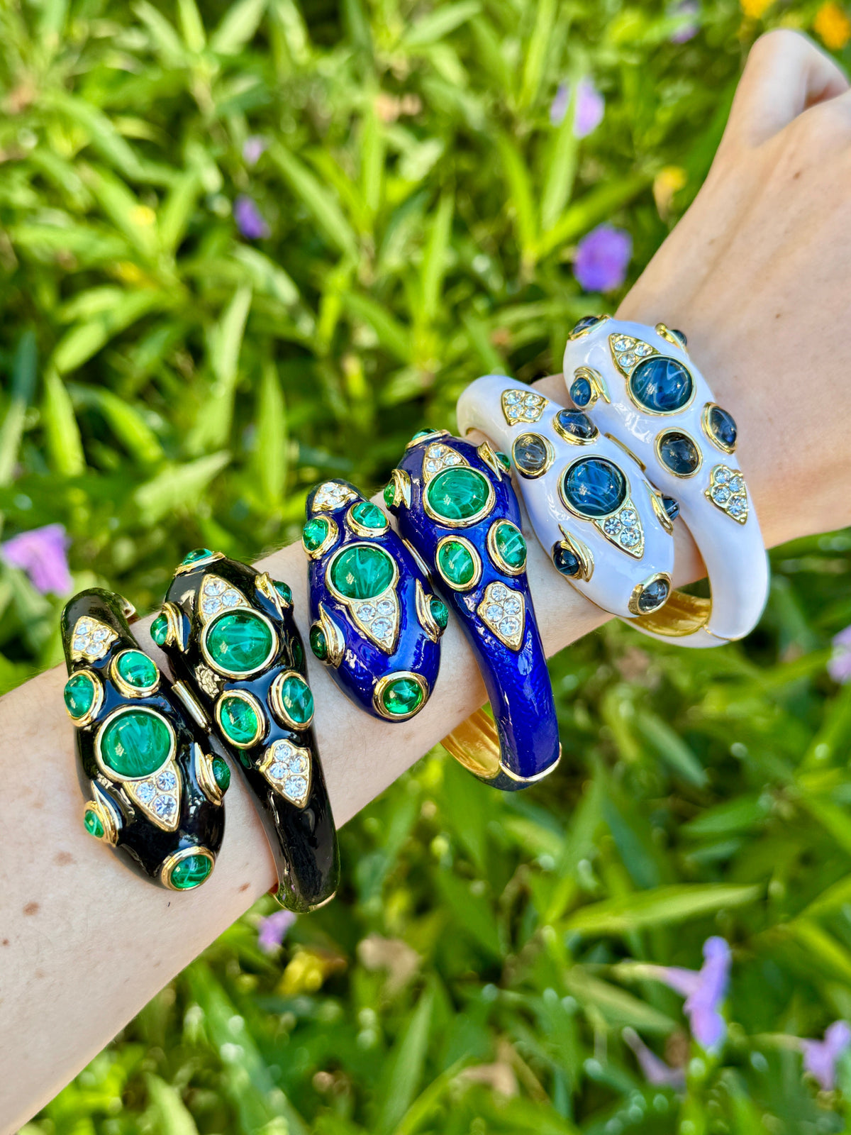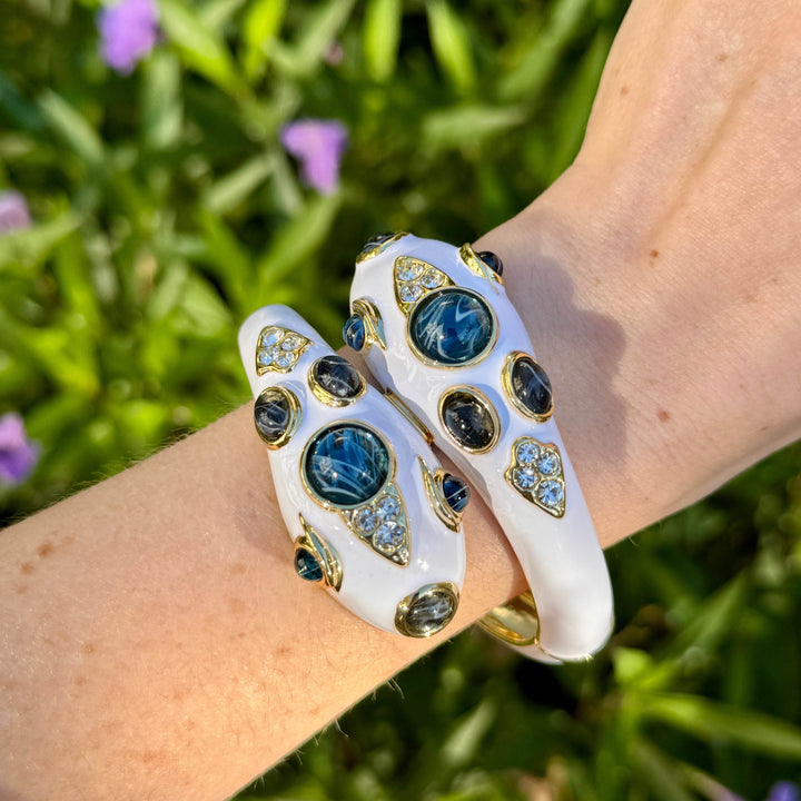 This bangle is finished in glossy white enamel. It is set in 18K gold plate over brass and features hand-set marbled blue glass cabochons and Austrian crystals.