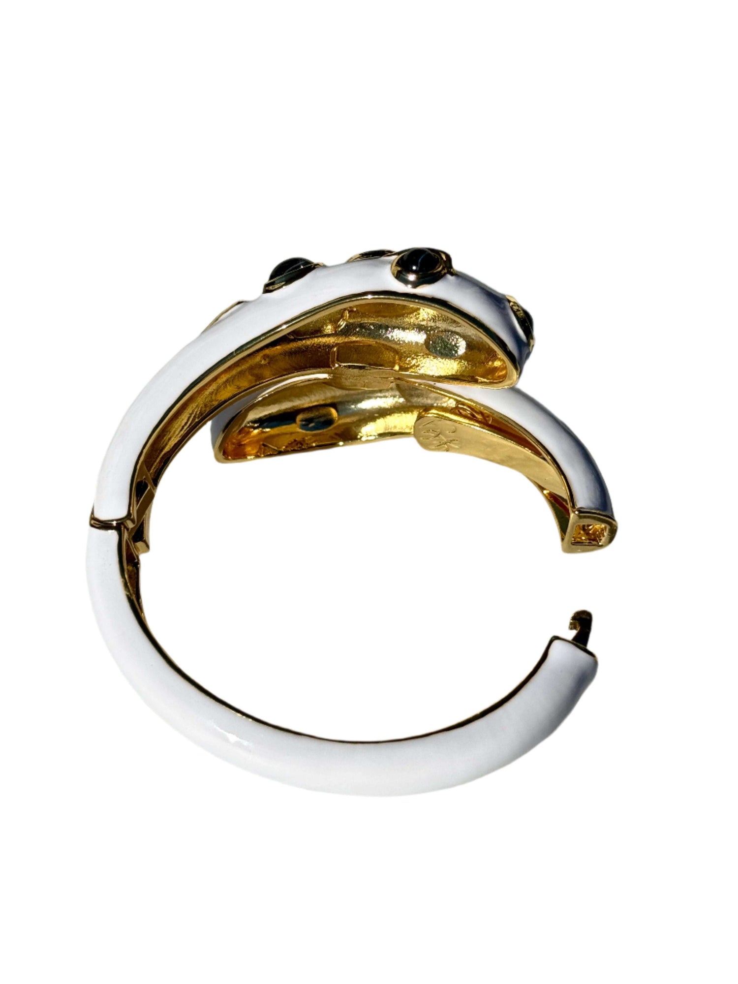This White Double Headed Snake Bracelet by Laura Gray is a vintage-inspired piece with a luxurious, modern flair. Finished in a glossy white enamel, it features hand-set marbled blue glass cabochons and Austrian crystals. Its unique double-headed snake design is a bold statement, perfect for adding a touch of sophisticated style to your jewelry collection.