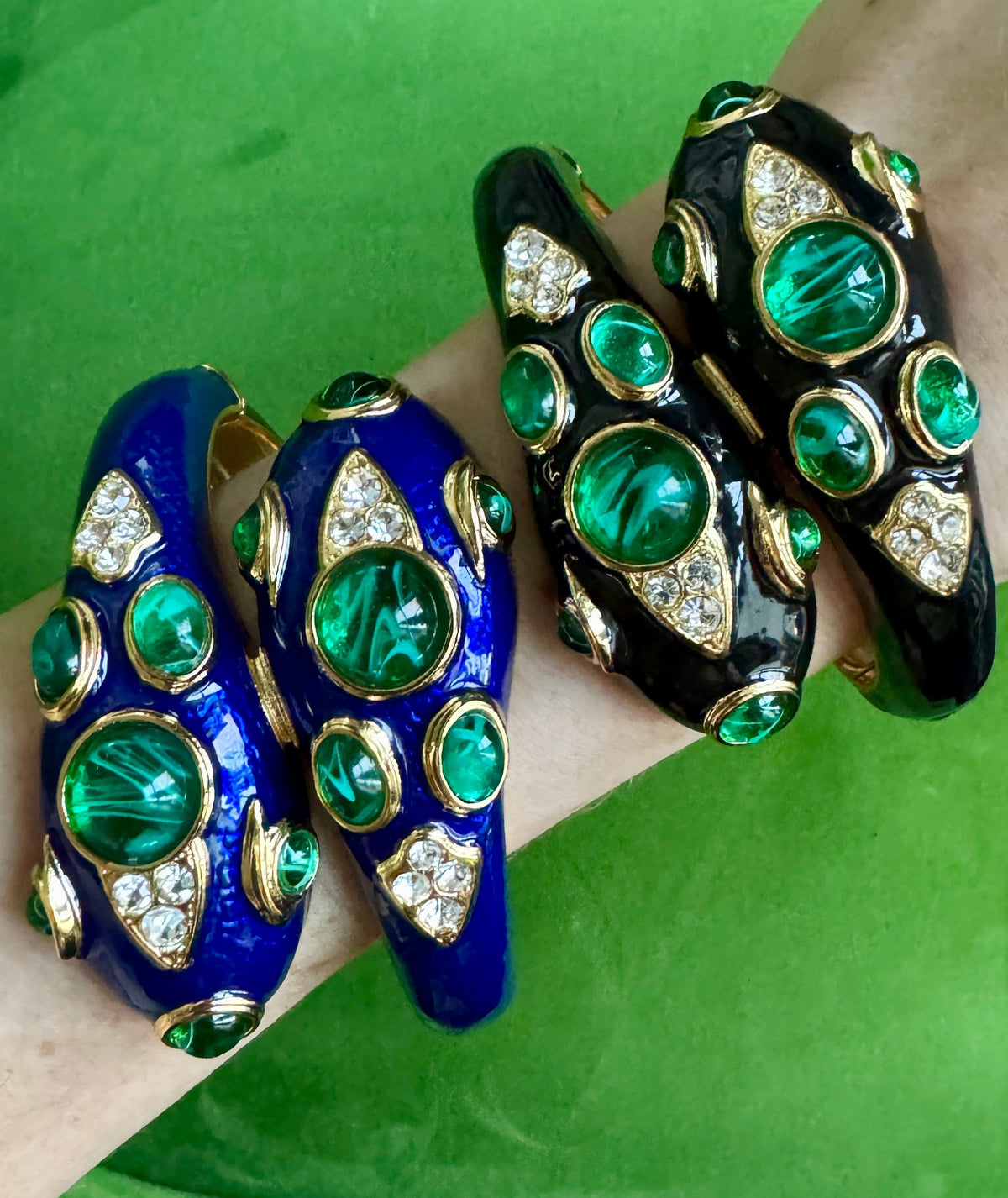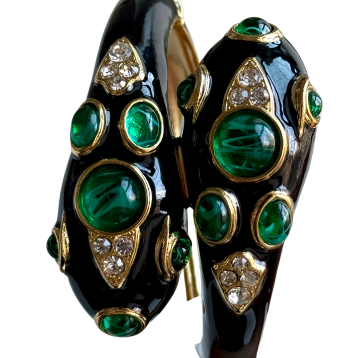This cuff bracelet is made of 18K gold plate over brass. It features rich, glossy black enamel, marbled green glass cabochons, and Austrian crystals.