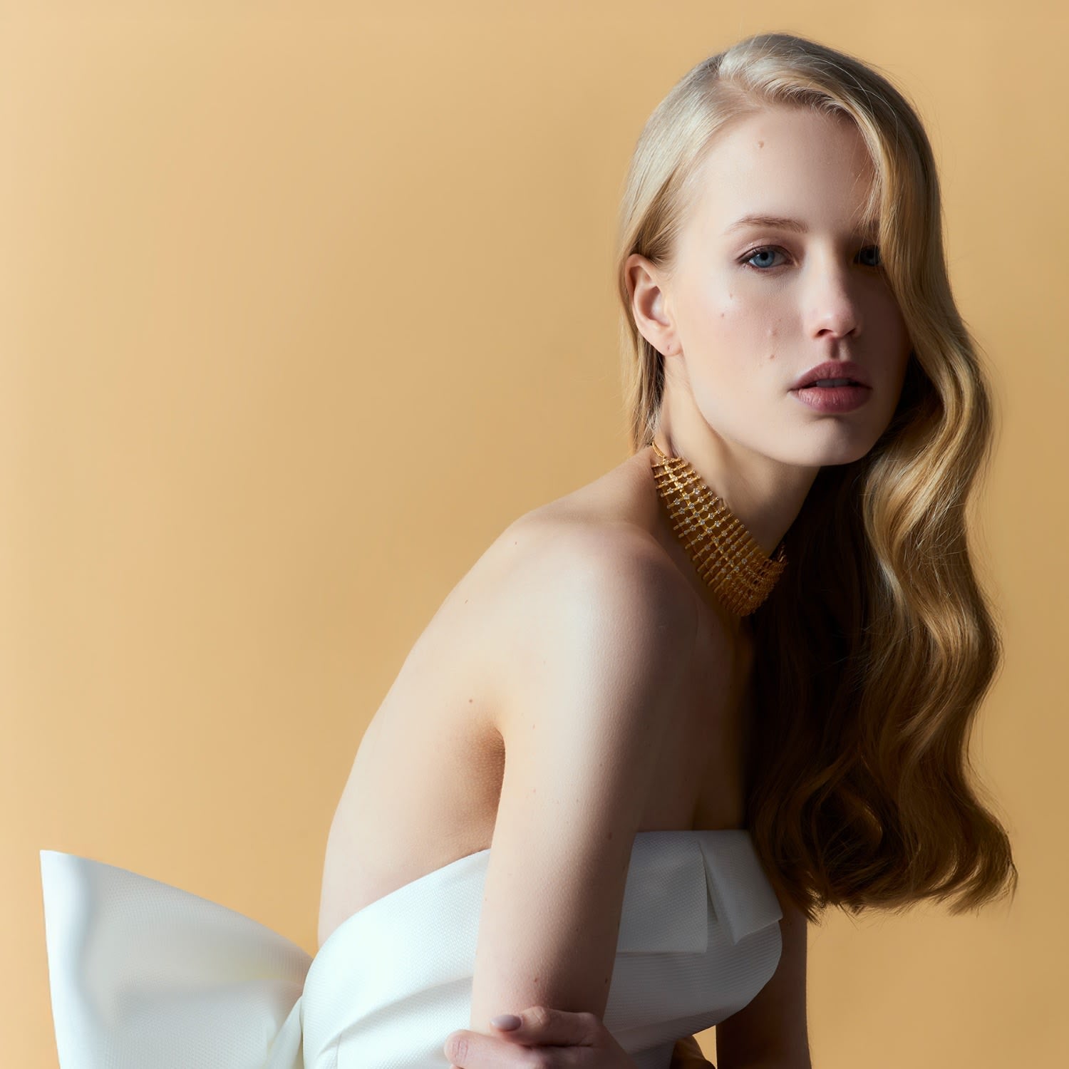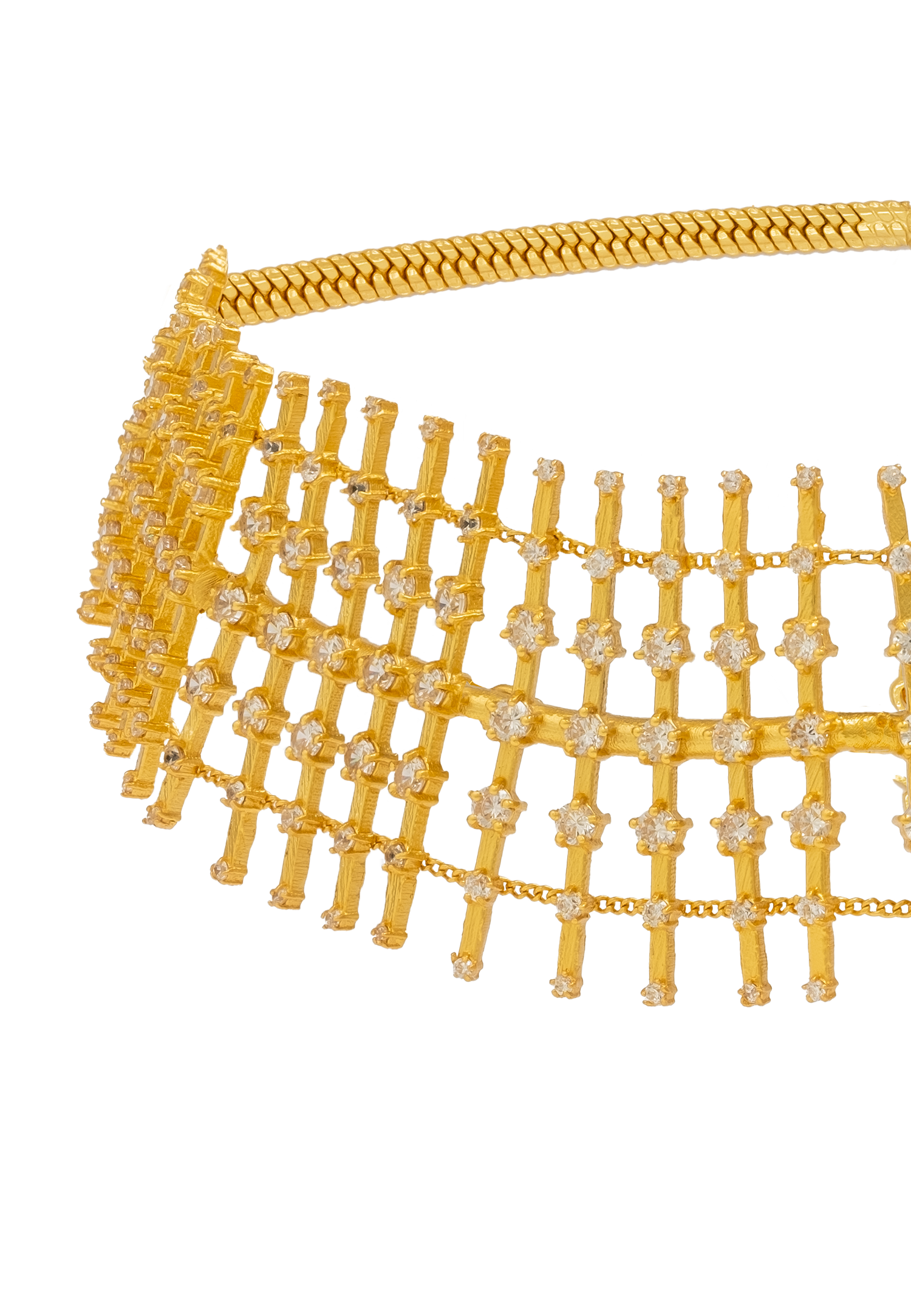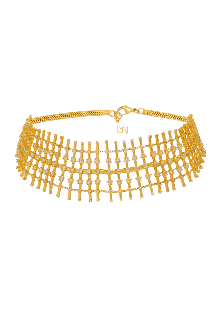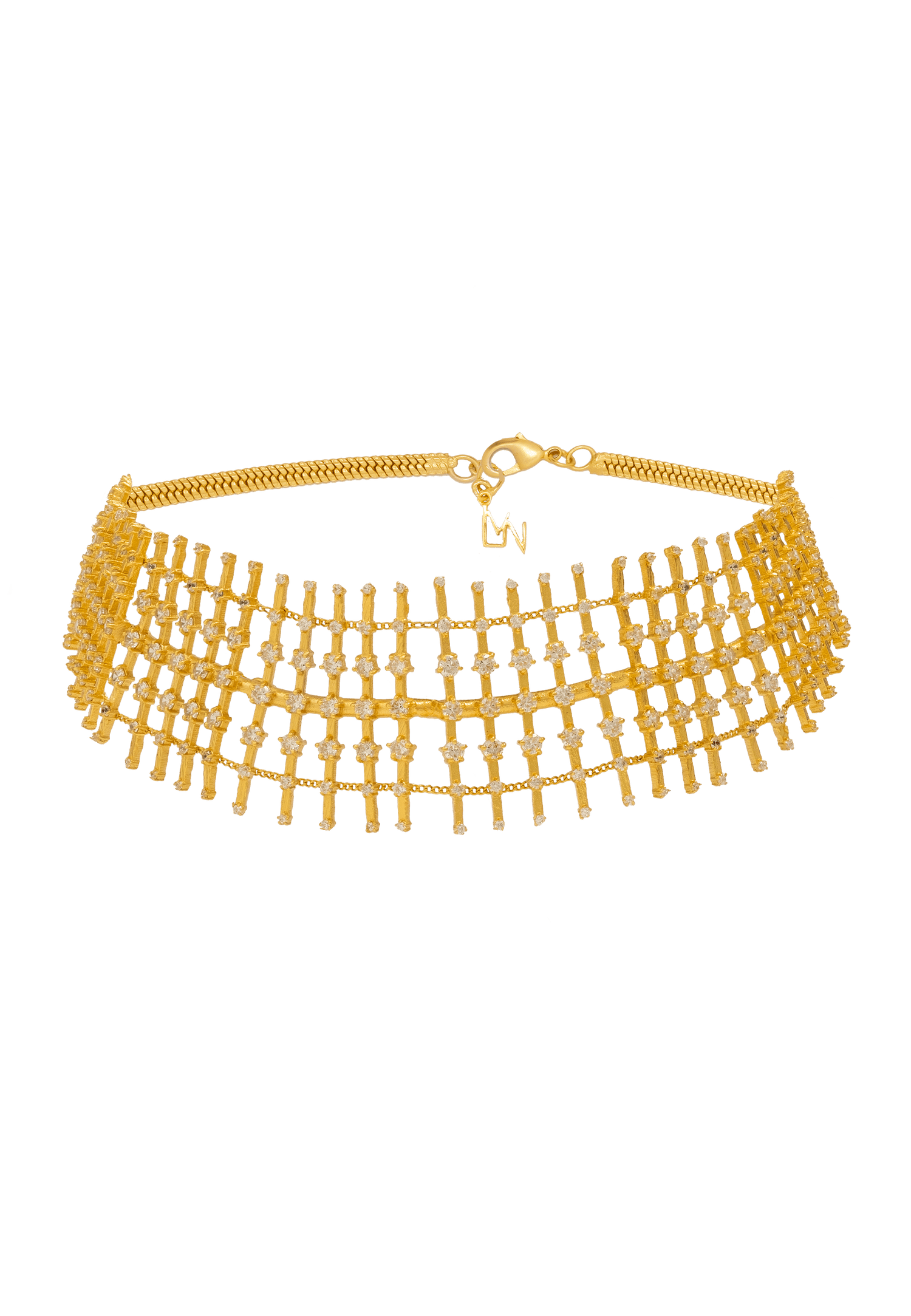 This choker is handcrafted from an unspecified base metal, plated in 22-karat gold, and set with zirconia. It is hypoallergenic and nickel-free.
