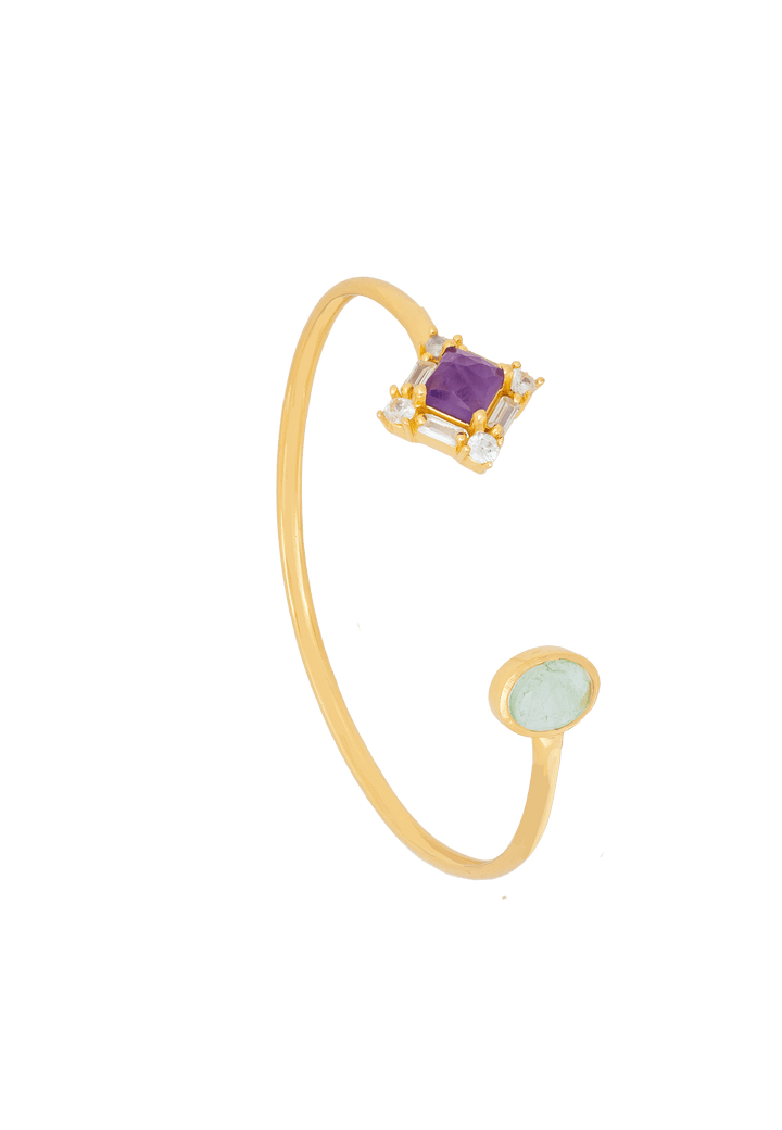 The Polaris Purple Bracelet is a celestial and elegant cuff bracelet. It is described as a "celestial elegance that will make you shine." Each element is carefully selected to evoke the ethereal beauty of the cosmos. The bracelet is hypoallergenic and nickel-free, making it suitable for all guests. The materials are not explicitly stated, but the description mentions a "delicate and detailed setting."