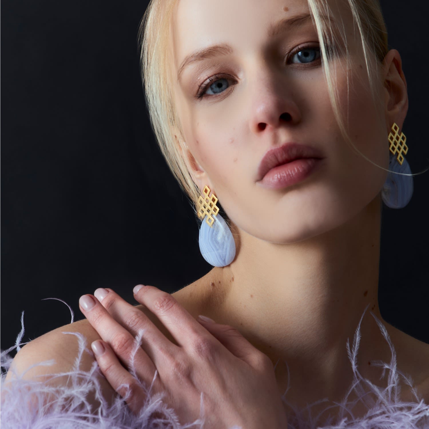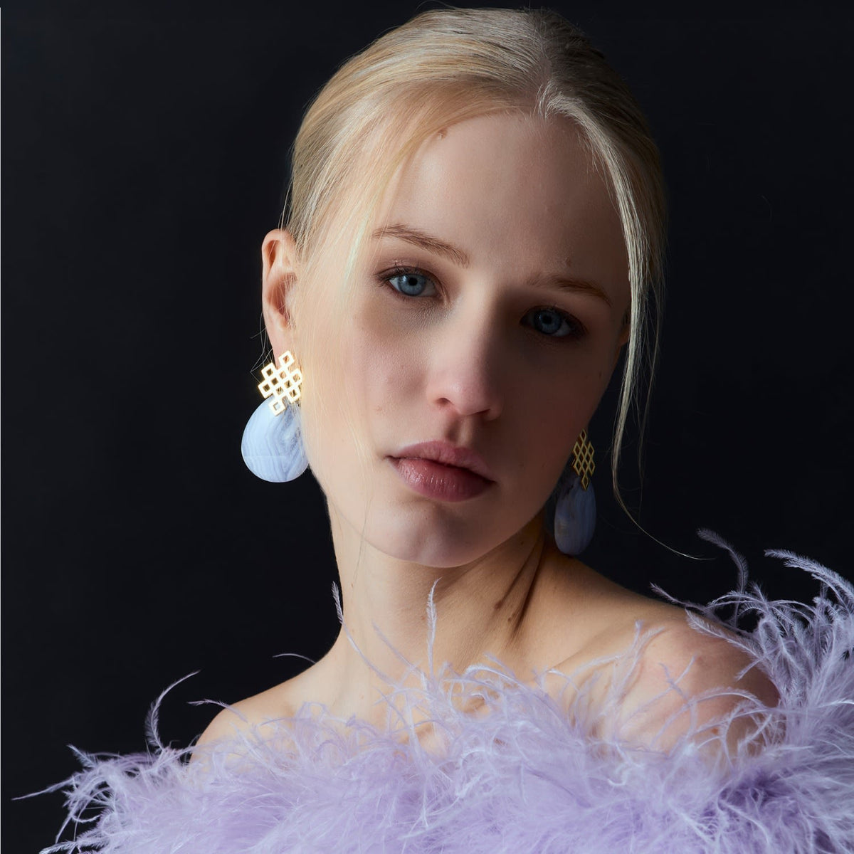 These earrings are made with a hypoallergenic and nickel-free body and feature semi-precious stones associated with the color blue.