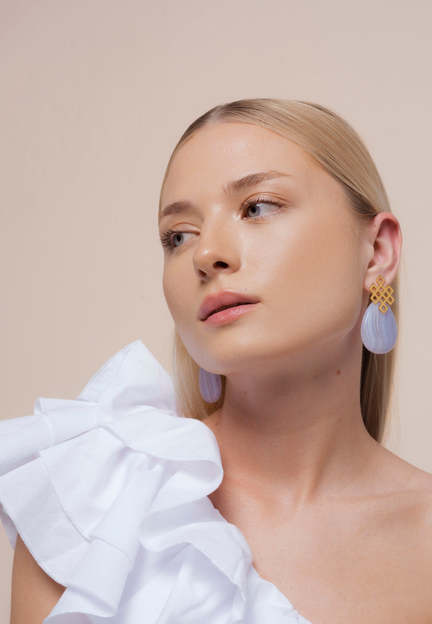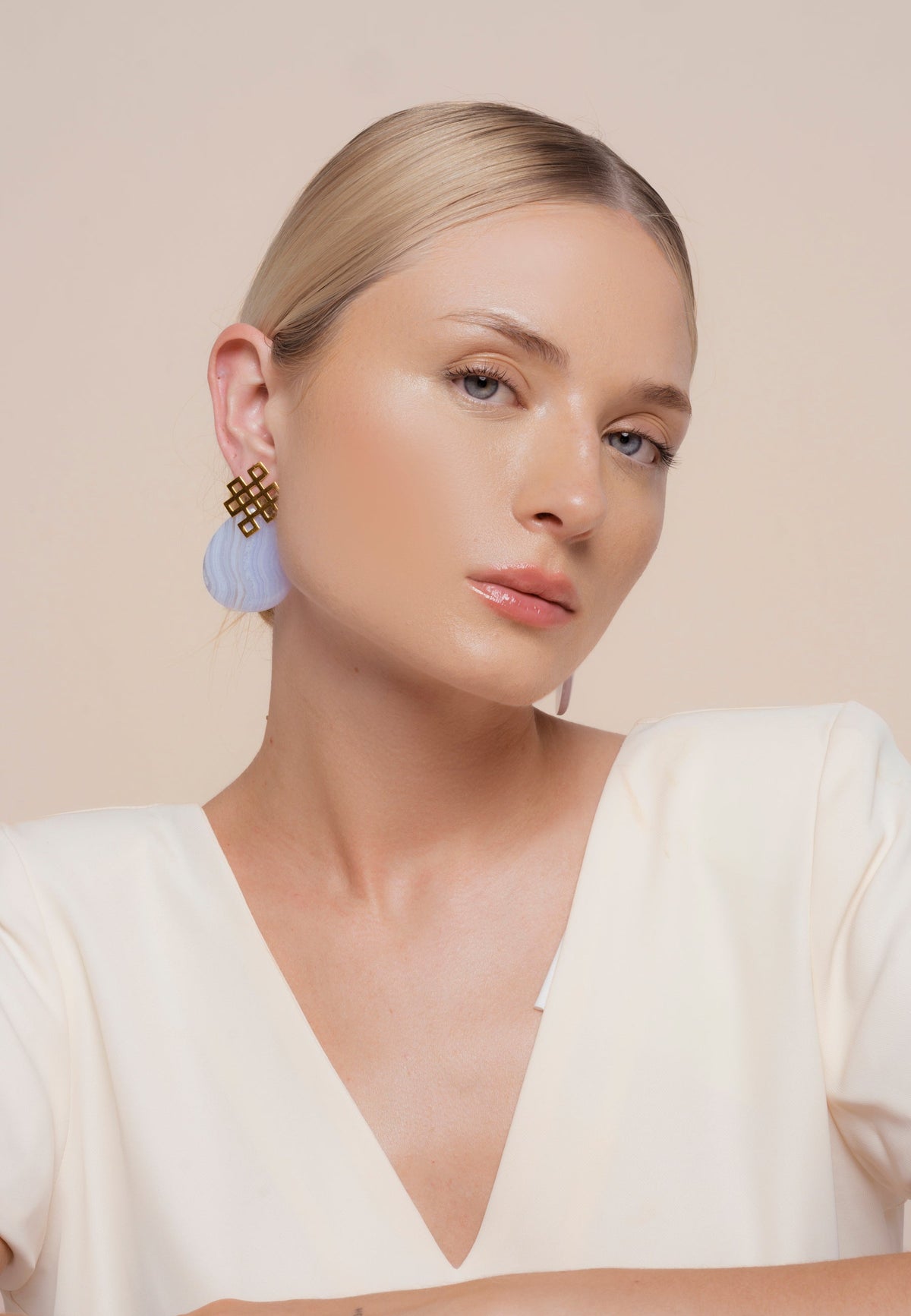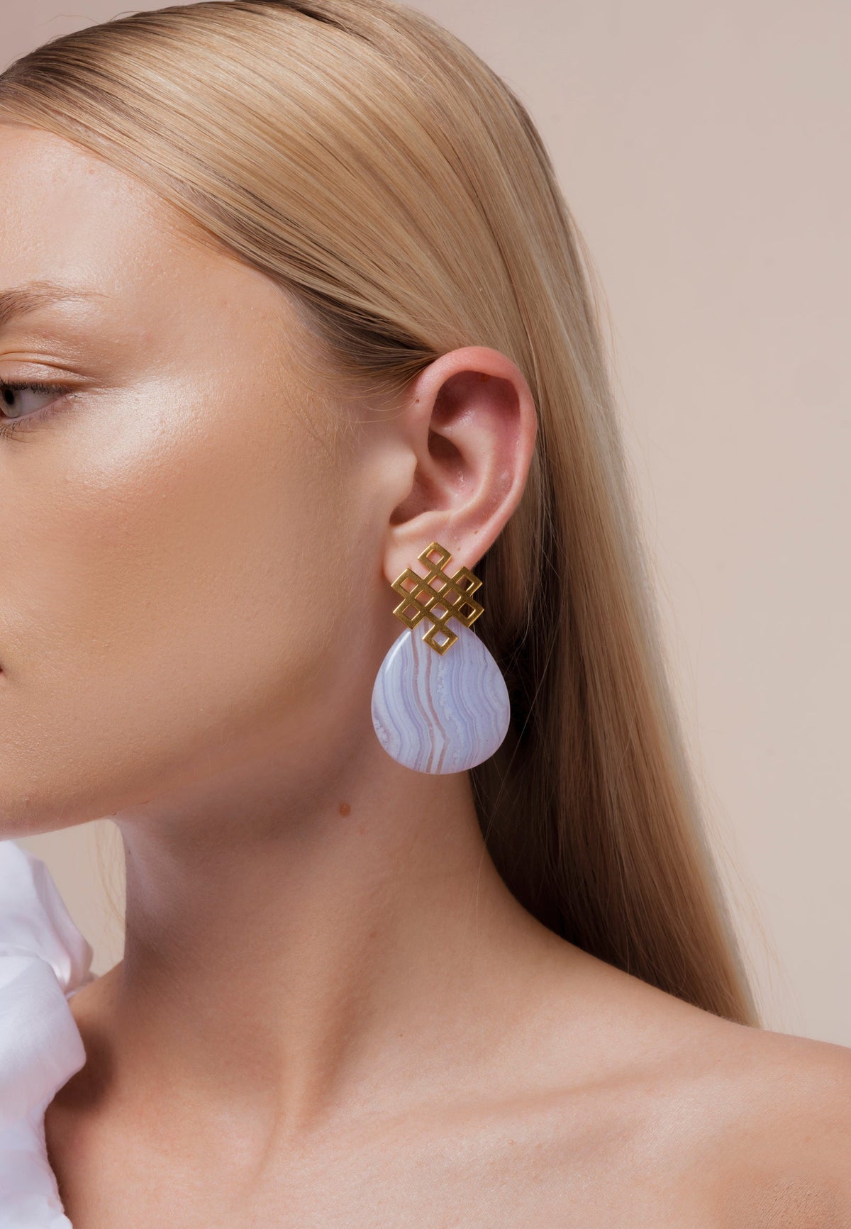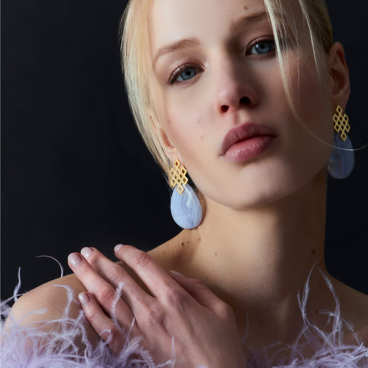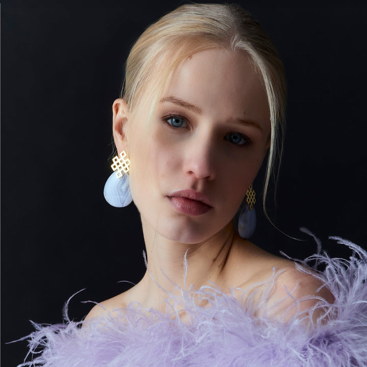 The Blue Endless Knot Earrings by Lavani Jewels are a symbolic and stylish accessory. The infinite knot, a Buddhist design, represents eternal connection and universal harmony. These blue earrings are made with semi-precious stones that are believed to help unblock chakras, allowing vital energy to flow again.