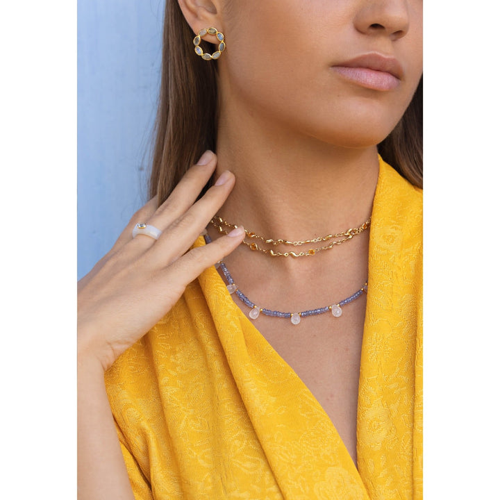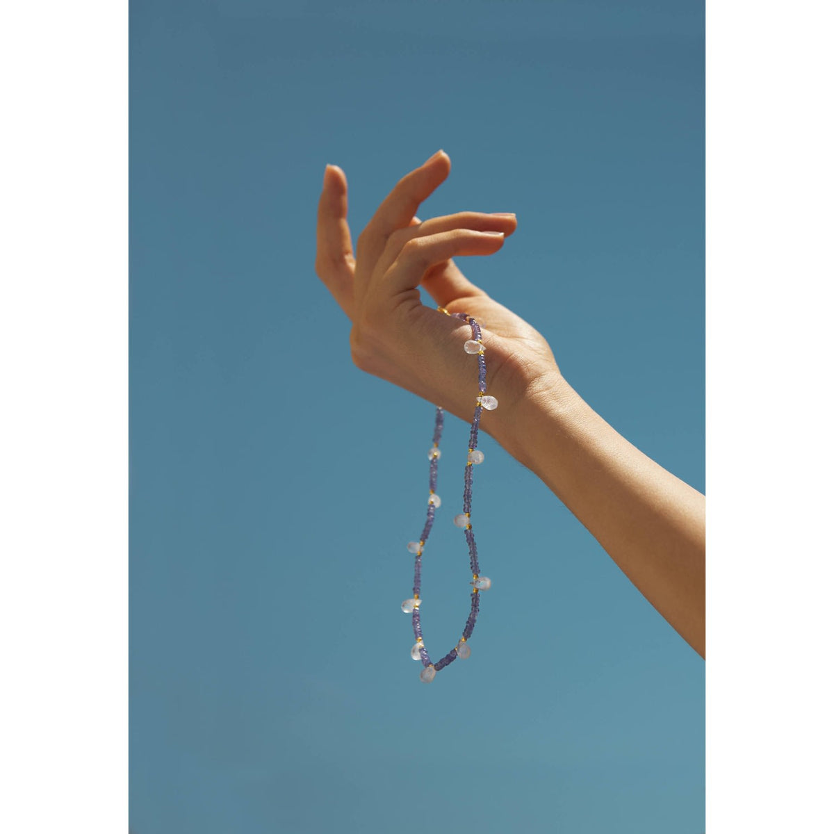 This White & Lilac Pedraza Tanzanite Necklace by Lavani Jewels is a classic piece with a different, modern touch. It features lilac tanzanite and moonstones, creating a beautiful contrast that will make it your new best ally for dressing up any look. Inspired by the magic of fireworks, this necklace is designed to ignite a spark within you and help you shine. It's perfect for both simple outfits that need an elegant touch or to complete your most sophisticated looks.