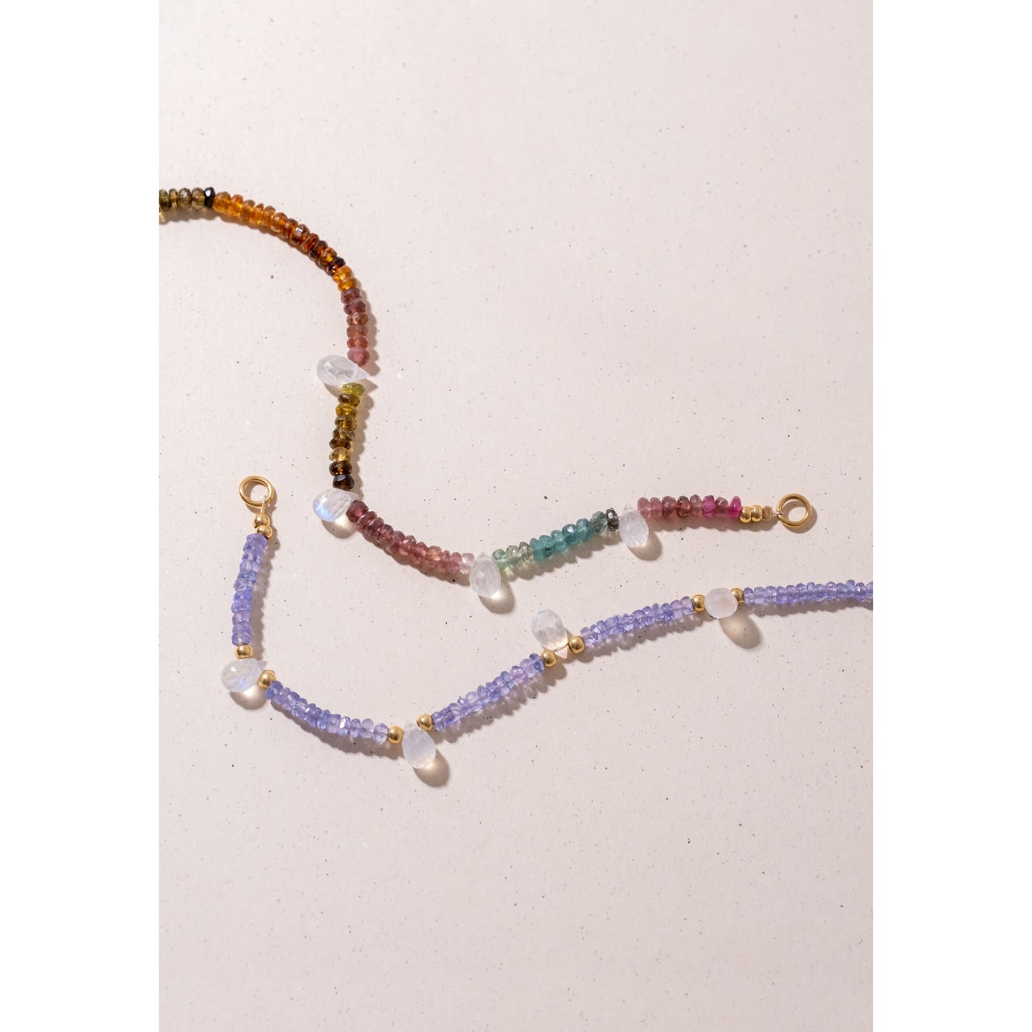 This necklace has a 22-carat gold finish with a traditional hook clasp. It features lilac tanzanite and moonstone beads.
