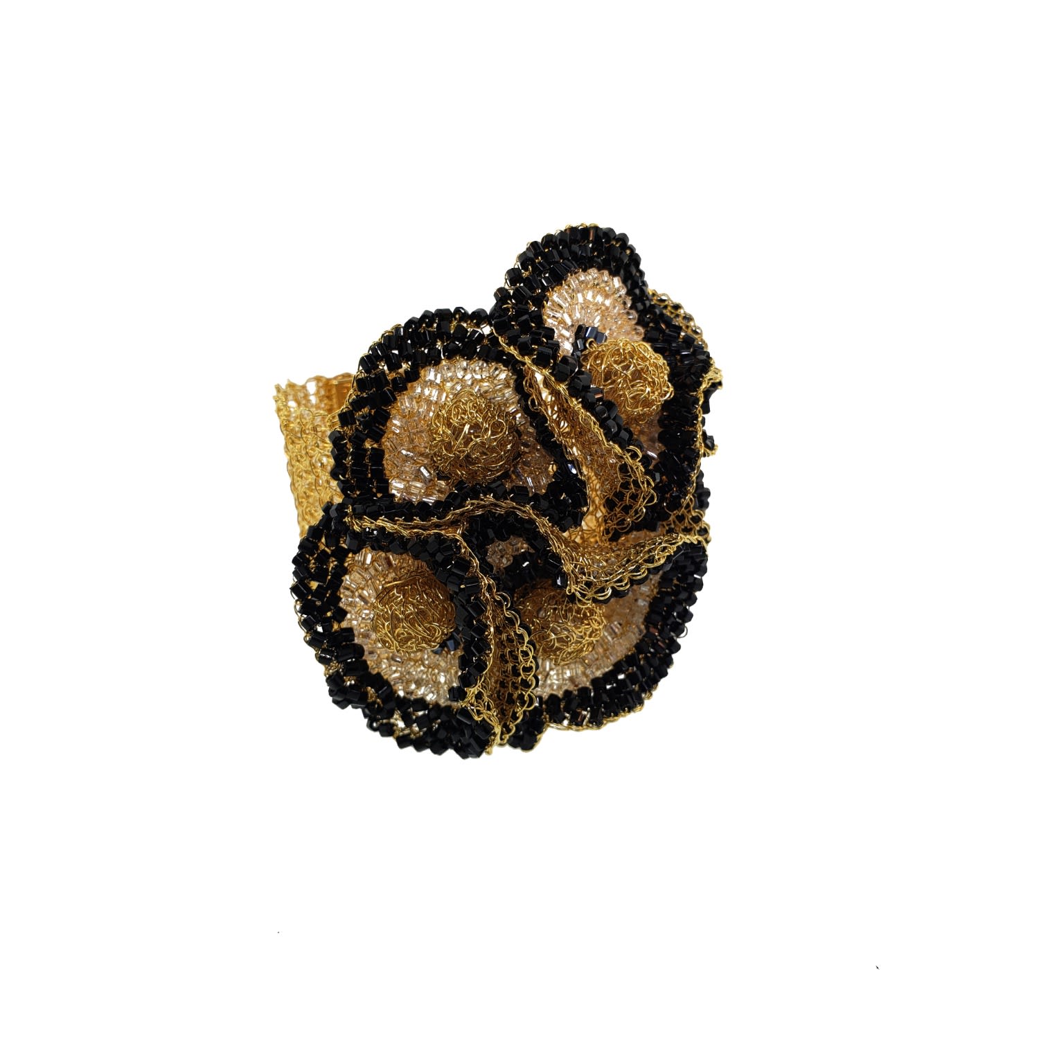 Hand-crocheted from hypoallergenic and nickel-free 18-karat gold-plated wire. This cuff features crystals and beads and has a magnetic clasp. It is 100% handmade in Brazil.