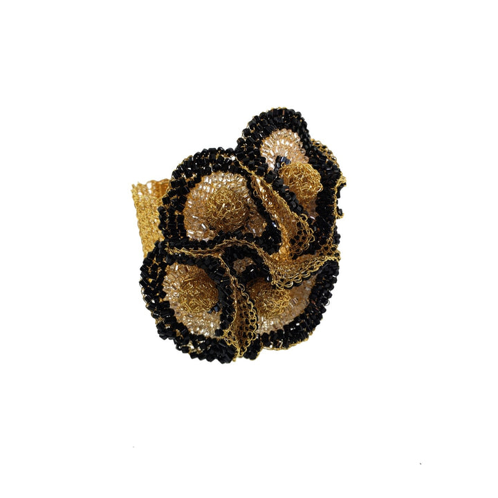 This Black Mix Buttercup Crystal Handmade Bracelet by Lavish by Tricia Milaneze is a hand-crocheted cuff that makes a bold statement. The shiny 18-karat gold-plated wire and sparkling crystals and beads create a captivating accessory. Each piece is unique and bears its artist's fingerprints, giving it a soul and beauty that has the power to inspire. The magnetic clasp ensures it's easy to put on and take off, making it both stylish and functional.