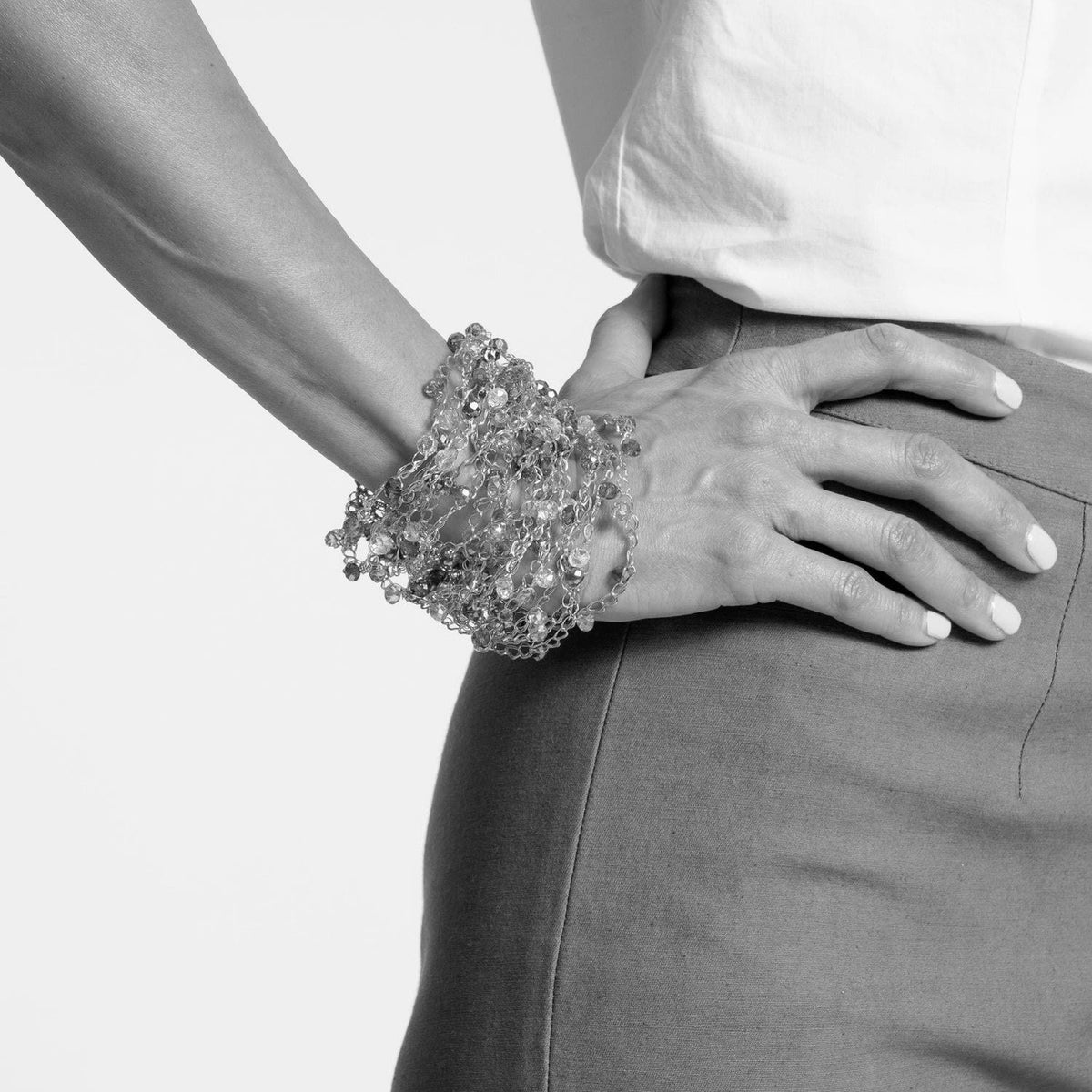 This Clear & Gold Multi Strings Handmade Bracelet by Lavish by Tricia Milaneze is a hand-crocheted cuff made by skilled Brazilian artisans. It features shiny 18 karat gold-filled wire and sparkling crystals and beads, creating a statement look that is lightweight and comfortable. The magnetic clasp makes it easy to put on and take off.