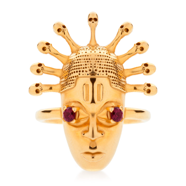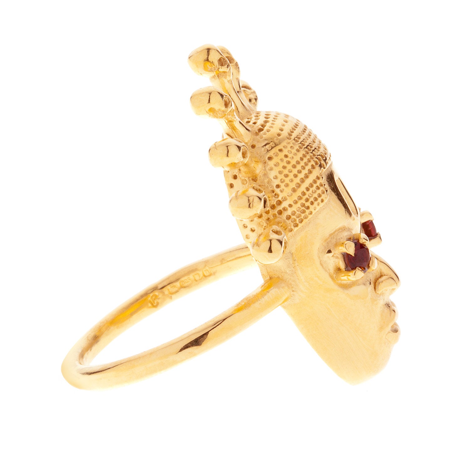 This Voodoo Legba Ring - Garnets & Gold by Lee Renee is a beautiful and meaningful accessory inspired by ancient civilizations. The ring features the voodoo god Legba, said to bring the wearer luck. Crafted from gold-plated silver and set with two garnets for the eyes, this ring is a powerful and unique statement piece.