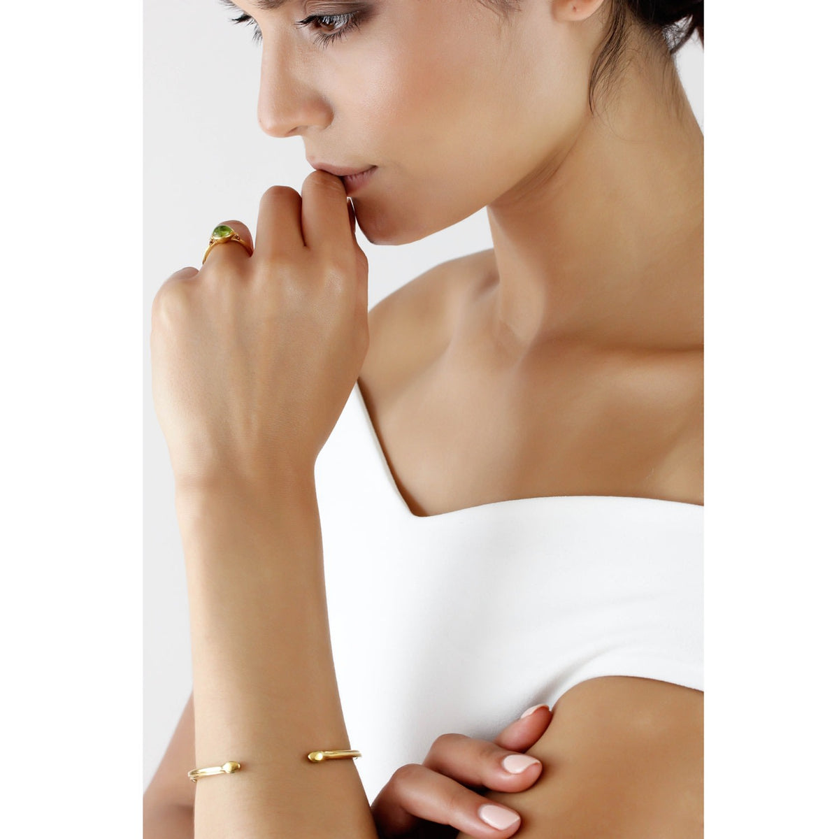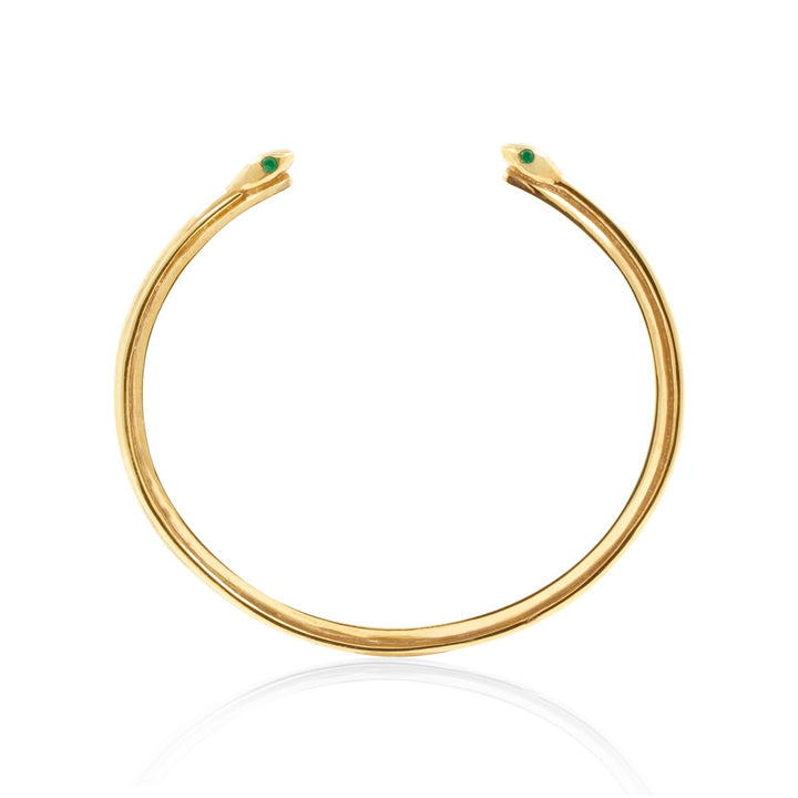 This bangle is handmade from recycled sterling silver and is heavily overlaid with 18ct gold. It is set with two brilliant-cut emeralds for the eyes.