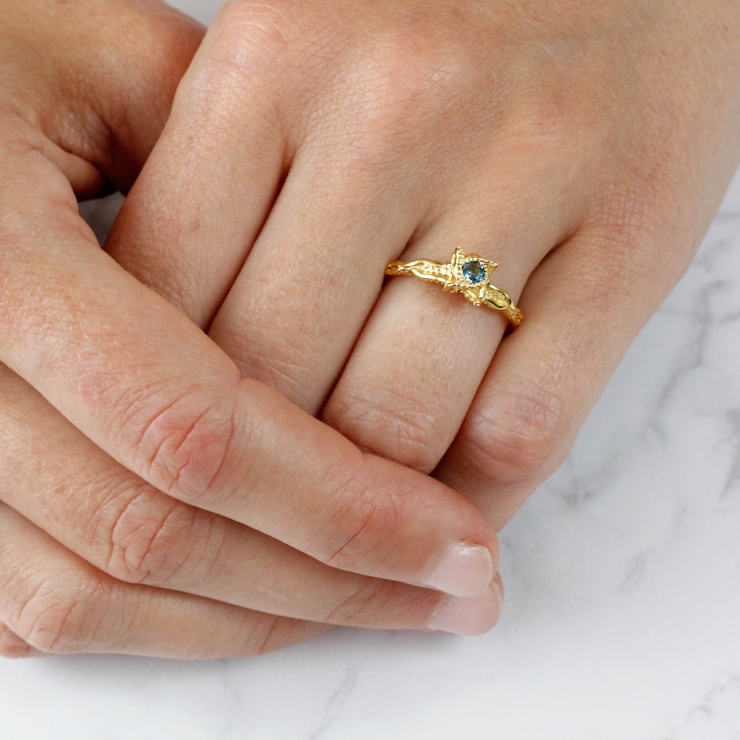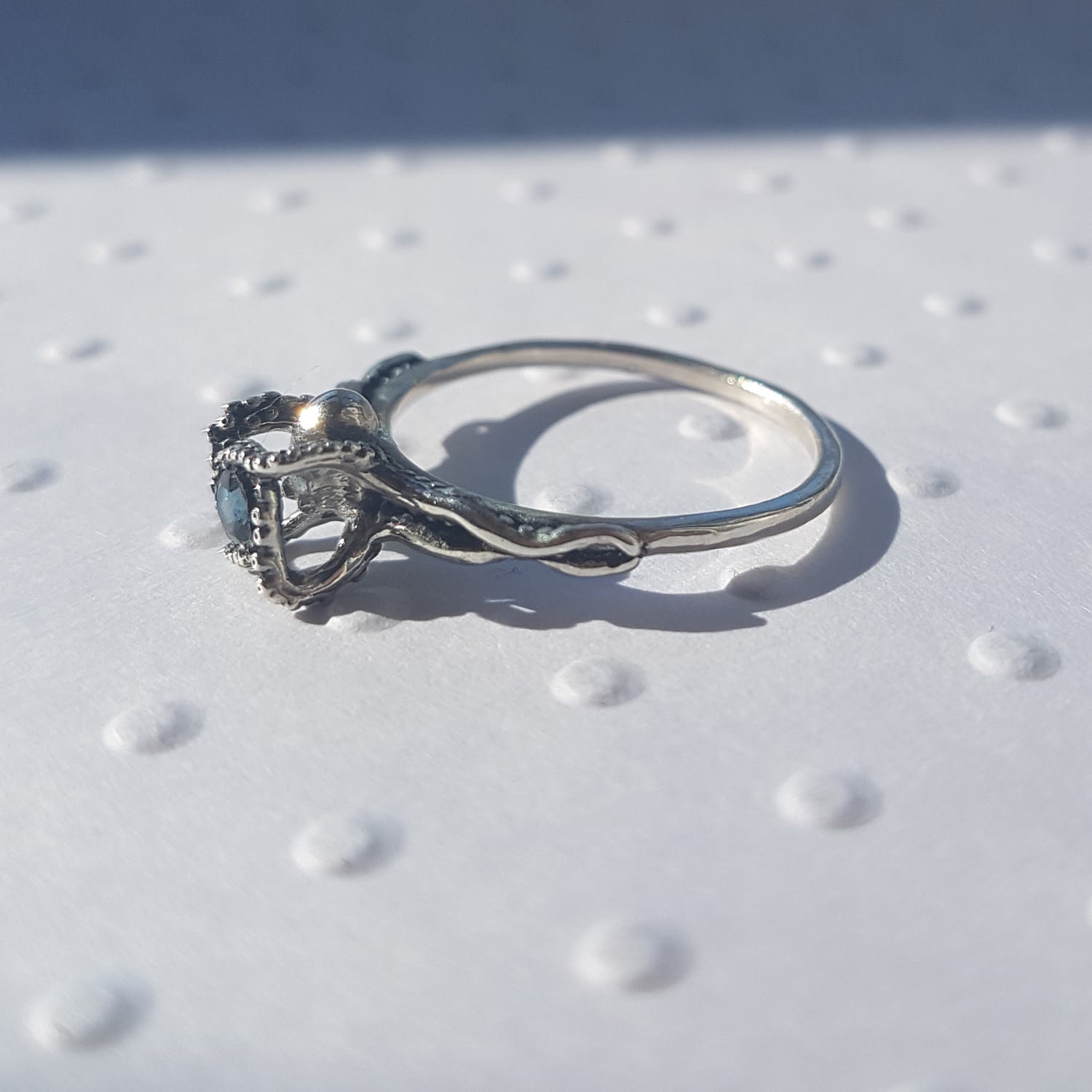 The Octopus Blue Topaz Ring - Silver by Lee Renee is a unique and playful cocktail ring inspired by nature documentaries. The ring features a detailed octopus holding a gorgeous London blue topaz gemstone. The ring is handmade from recycled and oxidized silver to bring out the intricate detailing, making it a true conversation starter.