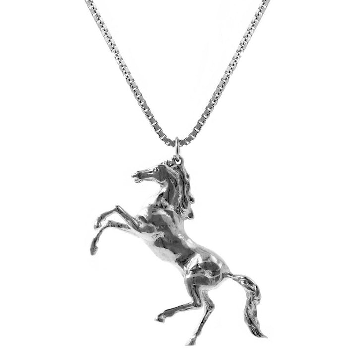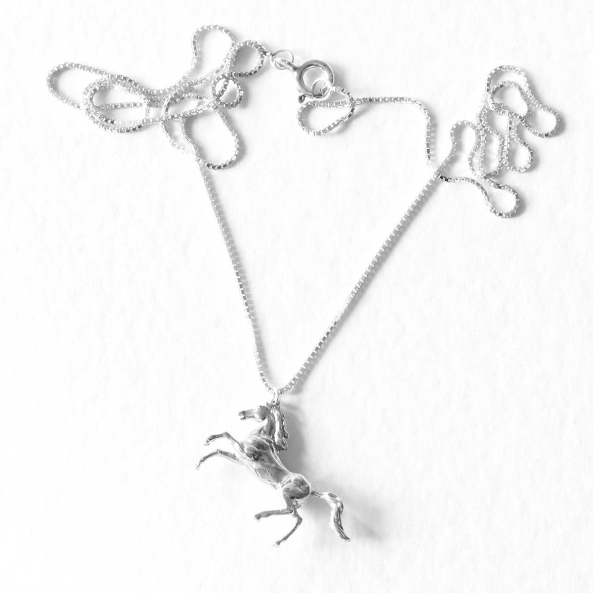 This necklace is handmade from recycled sterling silver. The horse pendant is on a 20-inch mirror box chain.