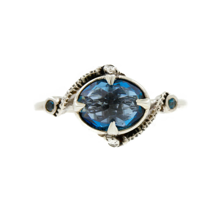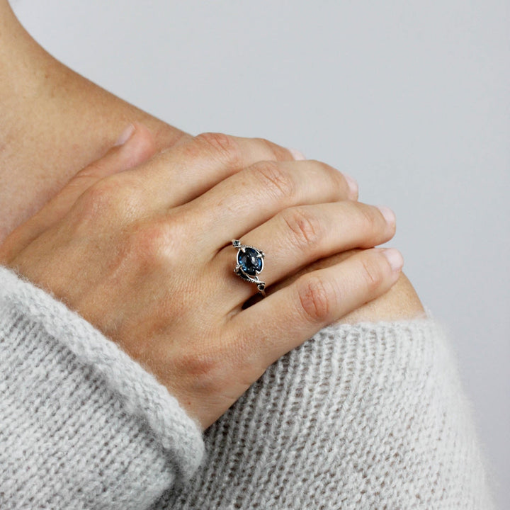 This ring is 100% handmade from recycled sterling silver and features a London blue topaz and two smaller blue topaz gemstones. The silver is oxidized to bring out the detailing.
