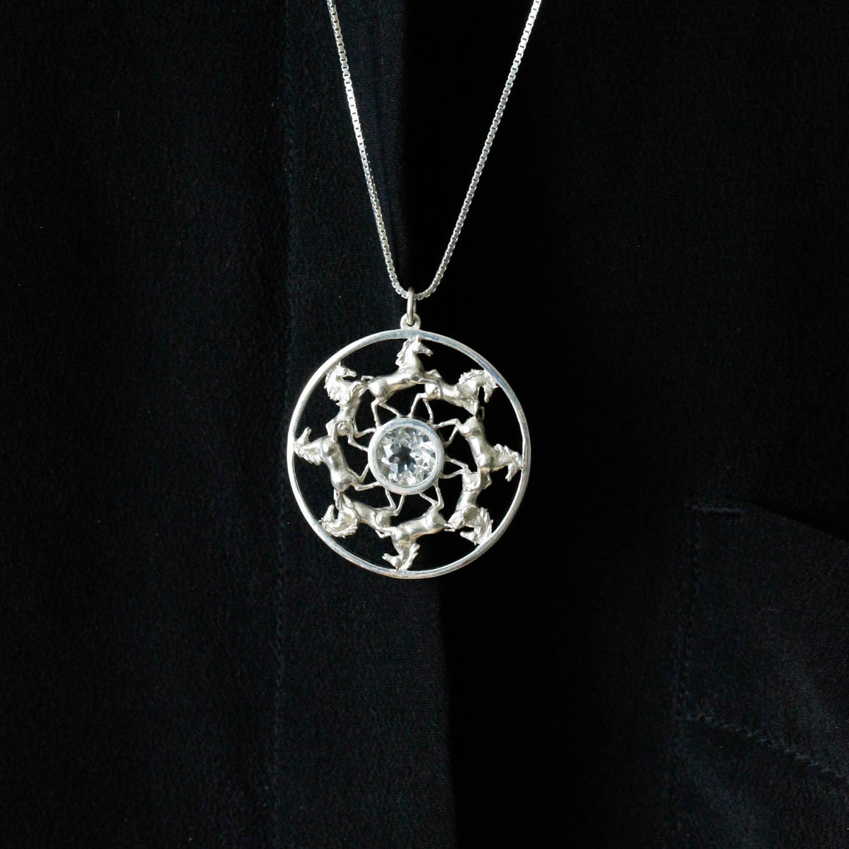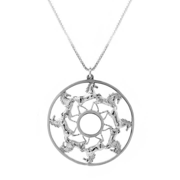 This Horse Medallion Necklace by Lee Renee is an exquisitely detailed piece that celebrates power, freedom, and adventure. It features eight wild horses intertwined in a wave-like formation, a symbol of intuition and movement. The medallion sits on a delicate chain, making it a beautiful and meaningful accessory perfect for embracing your wild side.