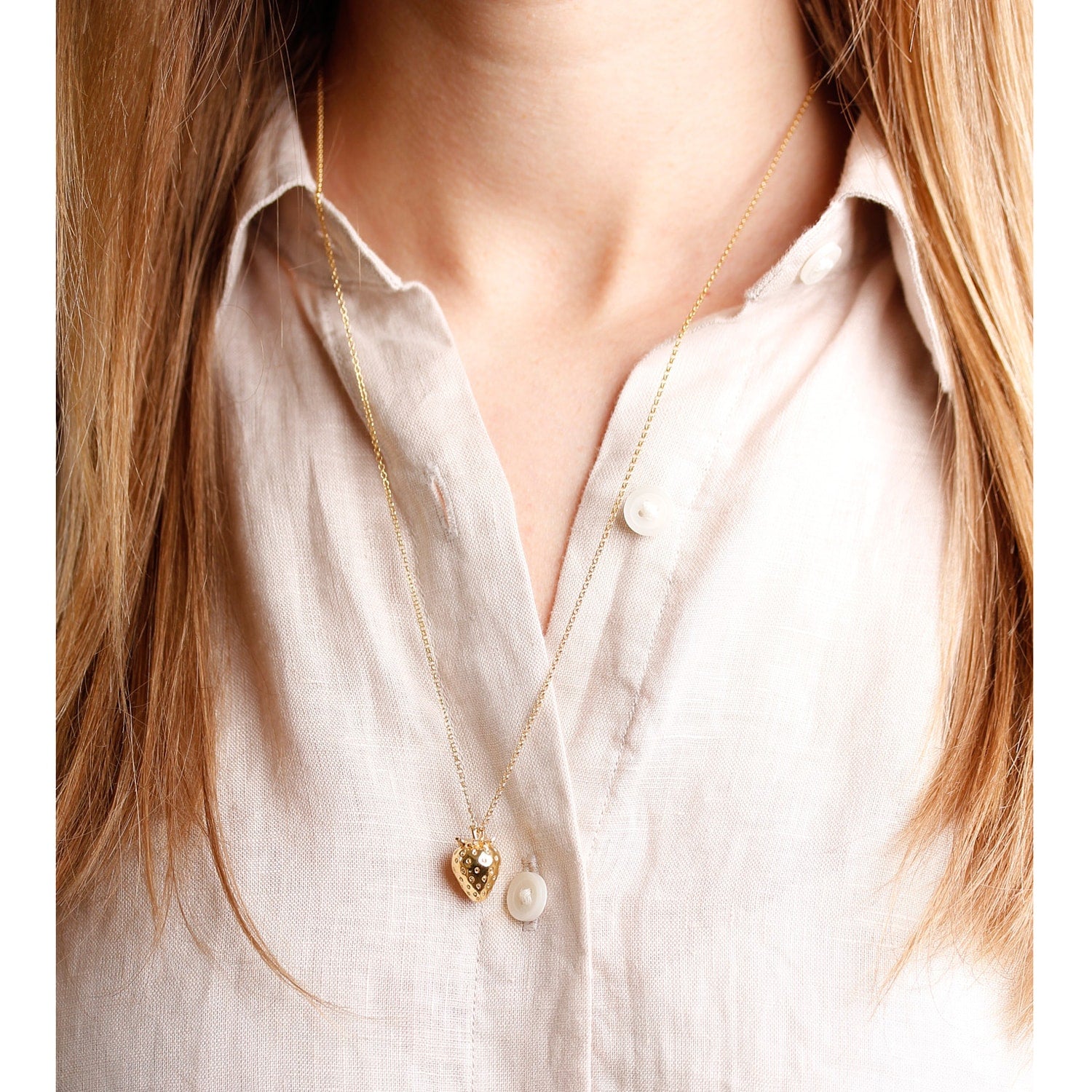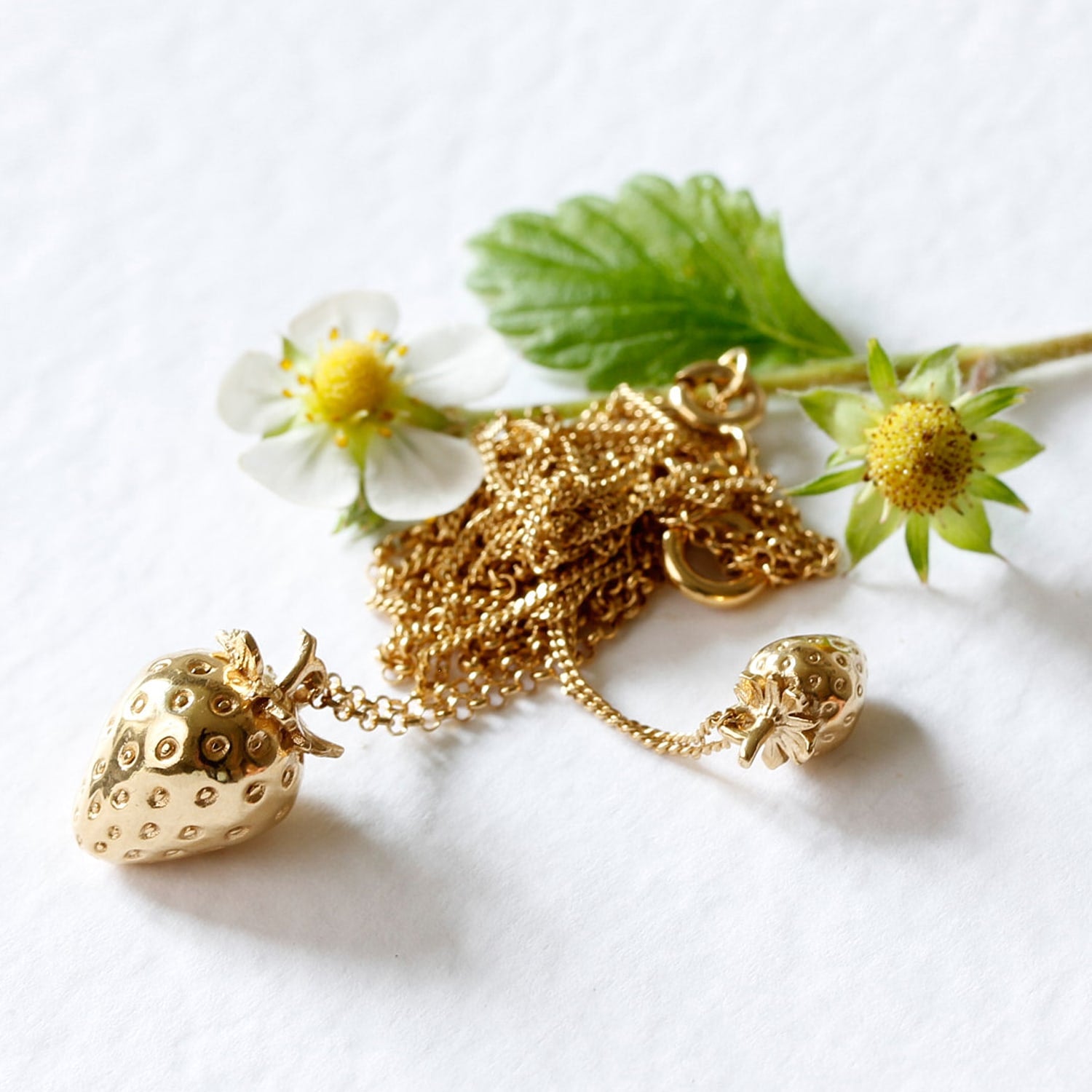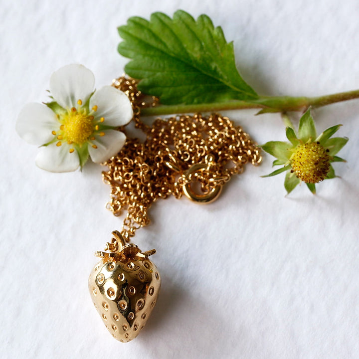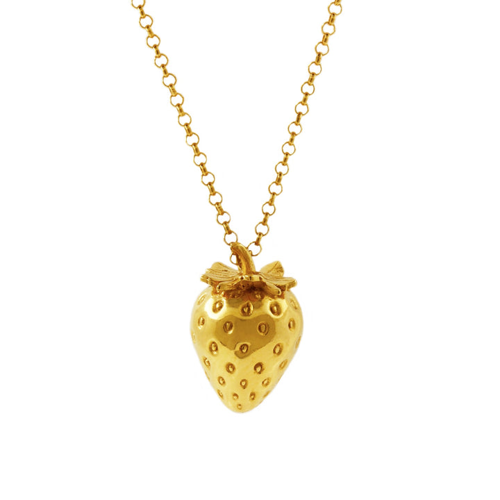 This necklace is handmade from sterling silver and Italian brass, which is then heavily overlaid with 18ct yellow gold vermeil. The pendant is a strawberry shape.
