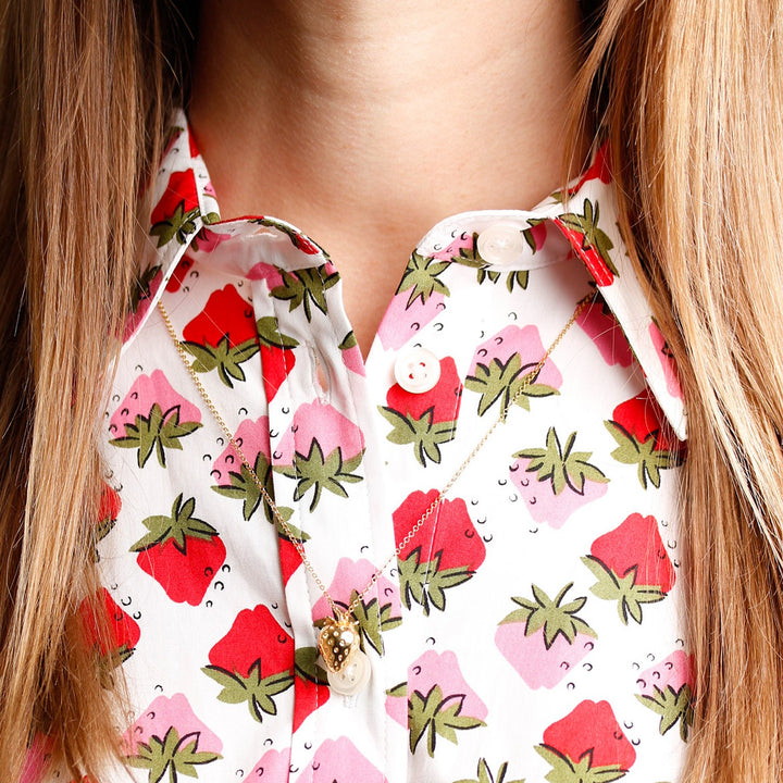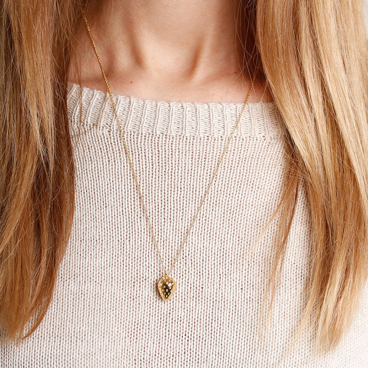 The Strawberry Necklace by Lee Renee is a sweet and intricate piece. It features a 3D strawberry pendant intricately carved with seeds and a stalk. Handmade in London, the pendant is made from recycled sterling silver and Italian brass and is then heavily overlaid with 18ct rose gold vermeil. The strawberry symbolizes love, purity, and abundance.