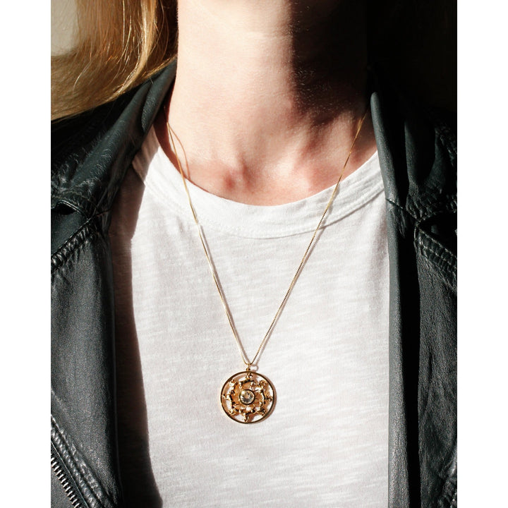 This medallion necklace is handcrafted in London from recycled sterling silver that is heavily overlaid with 18k yellow gold vermeil. It features a brilliant-cut white topaz gemstone.