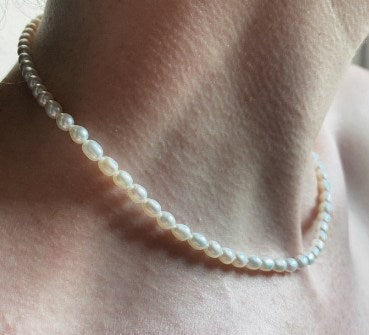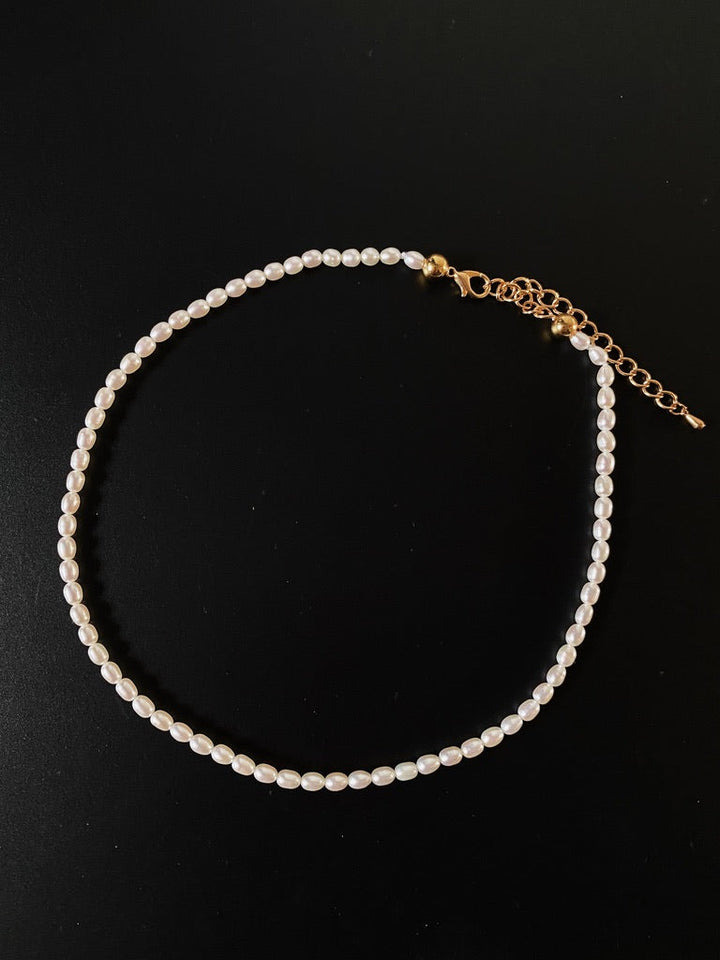 This pearl necklace is made with freshwater rice pearls. It has a gold-plated clasp and a chain extension on brass. The necklace is 15 inches long with a 4.5cm extension.