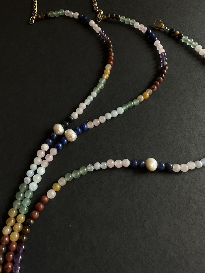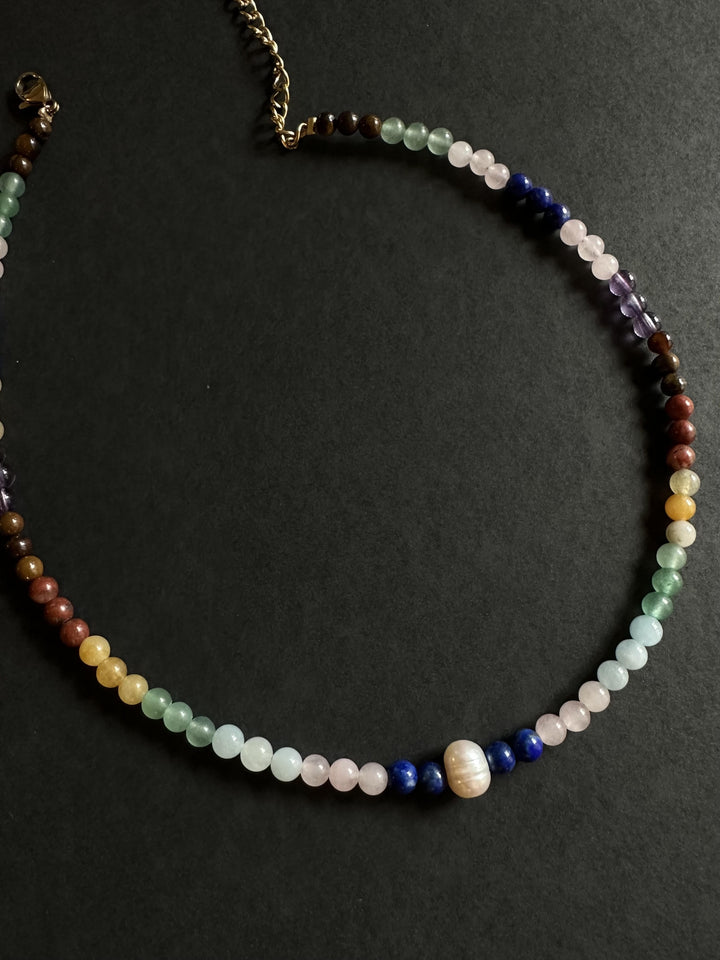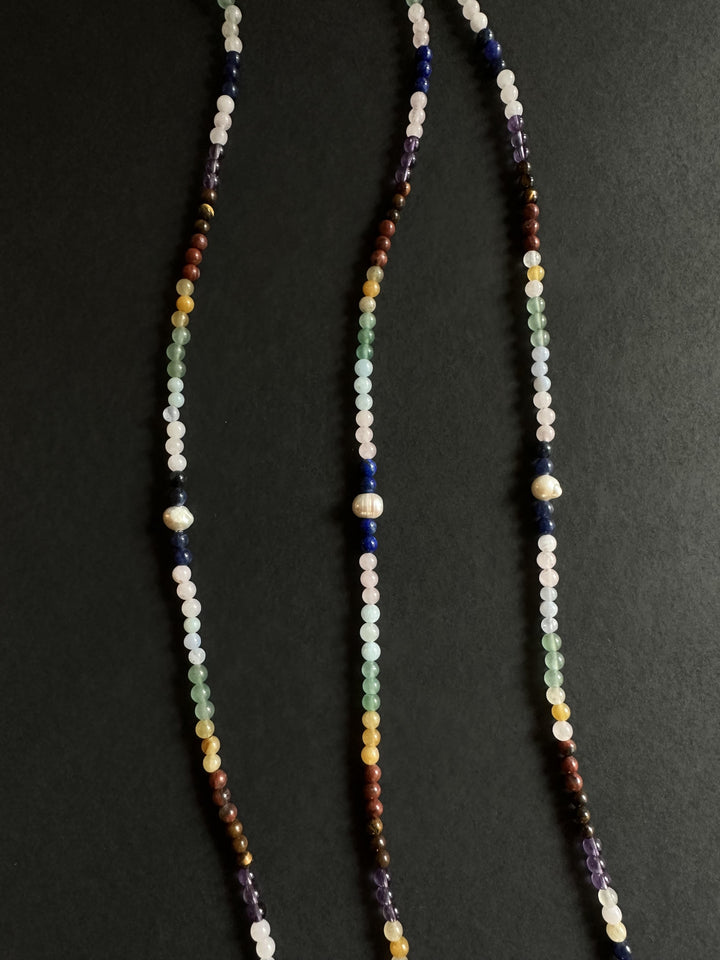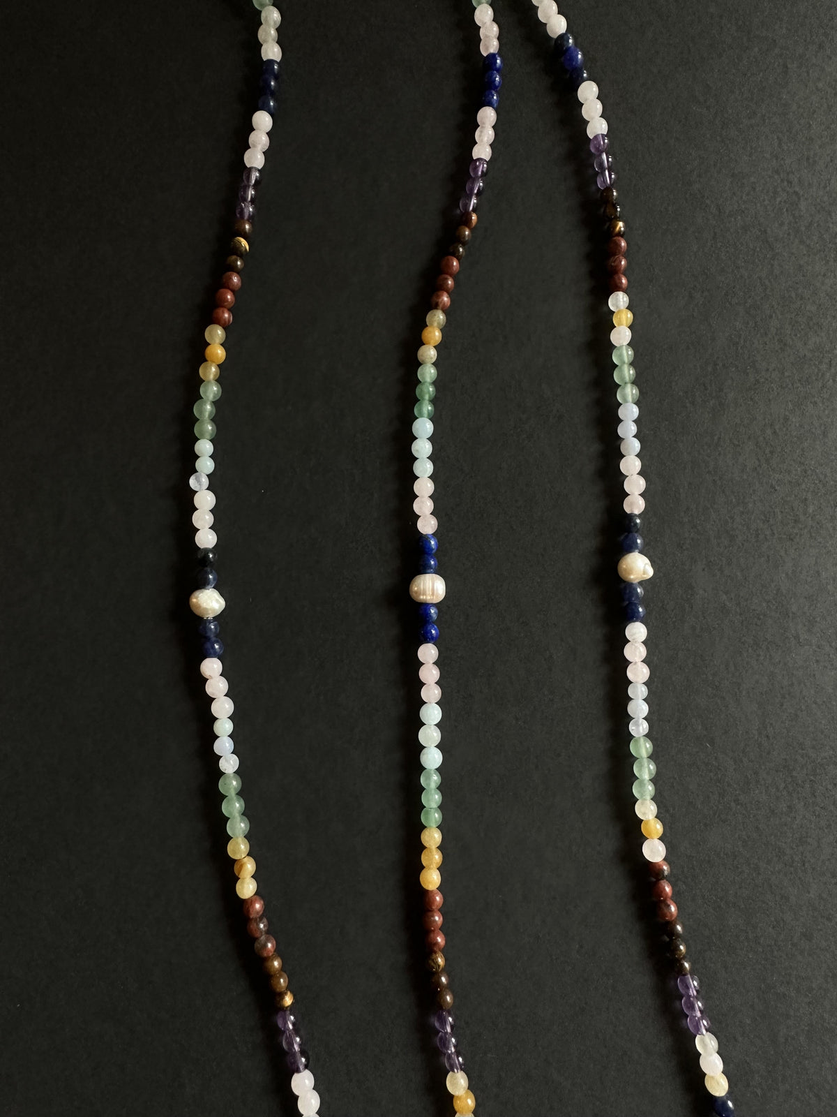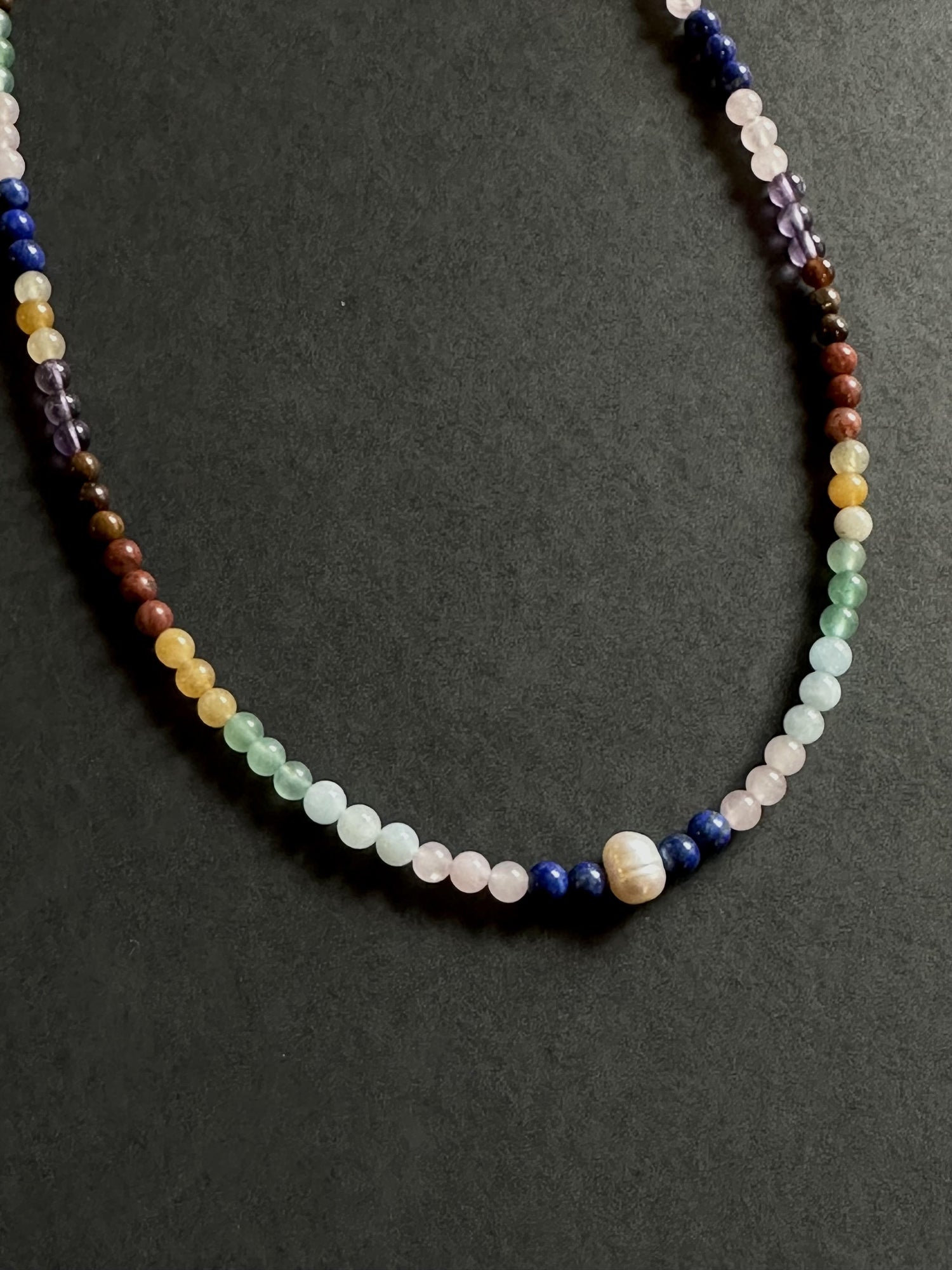 This beaded necklace is crafted with a variety of crystal stones, including Lapis Lazuli, Sodalite, Rose Quartz, Aquamarine, Green Aventurine, Yellow Jade, Red Jasper, Tigers Eye, and Purple Amethyst. It also features a baroque freshwater pearl.