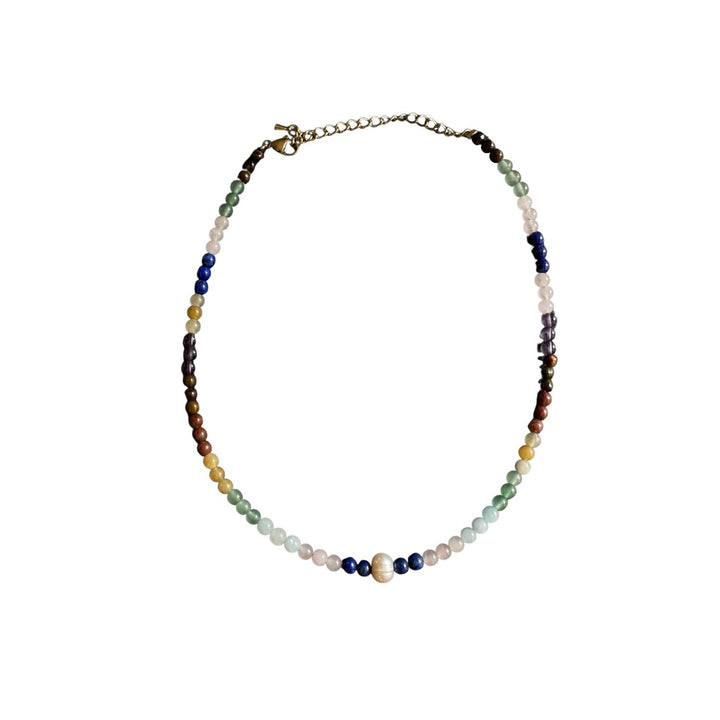 This Chakra Necklace by Lemuria Store is a unique and meaningful piece. It is created using beautiful crystal stones to represent and align with each chakra, with a baroque freshwater pearl in the center for purity and balance. This necklace is a personal and powerful accessory for those who appreciate the healing power of crystals.