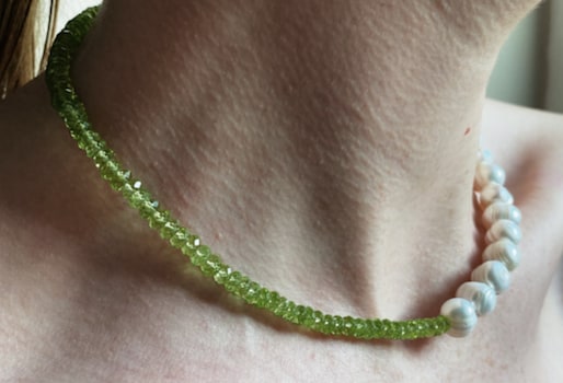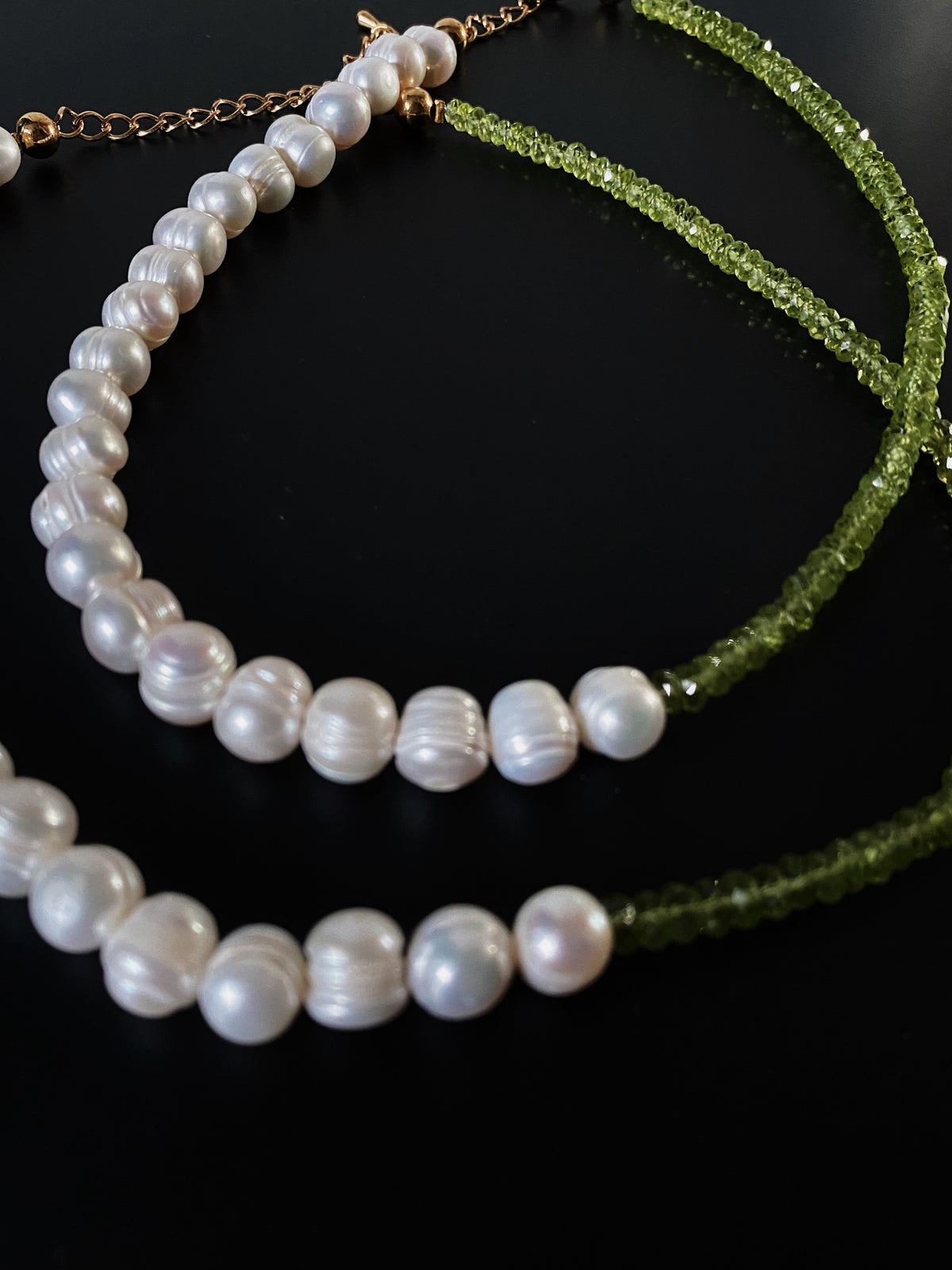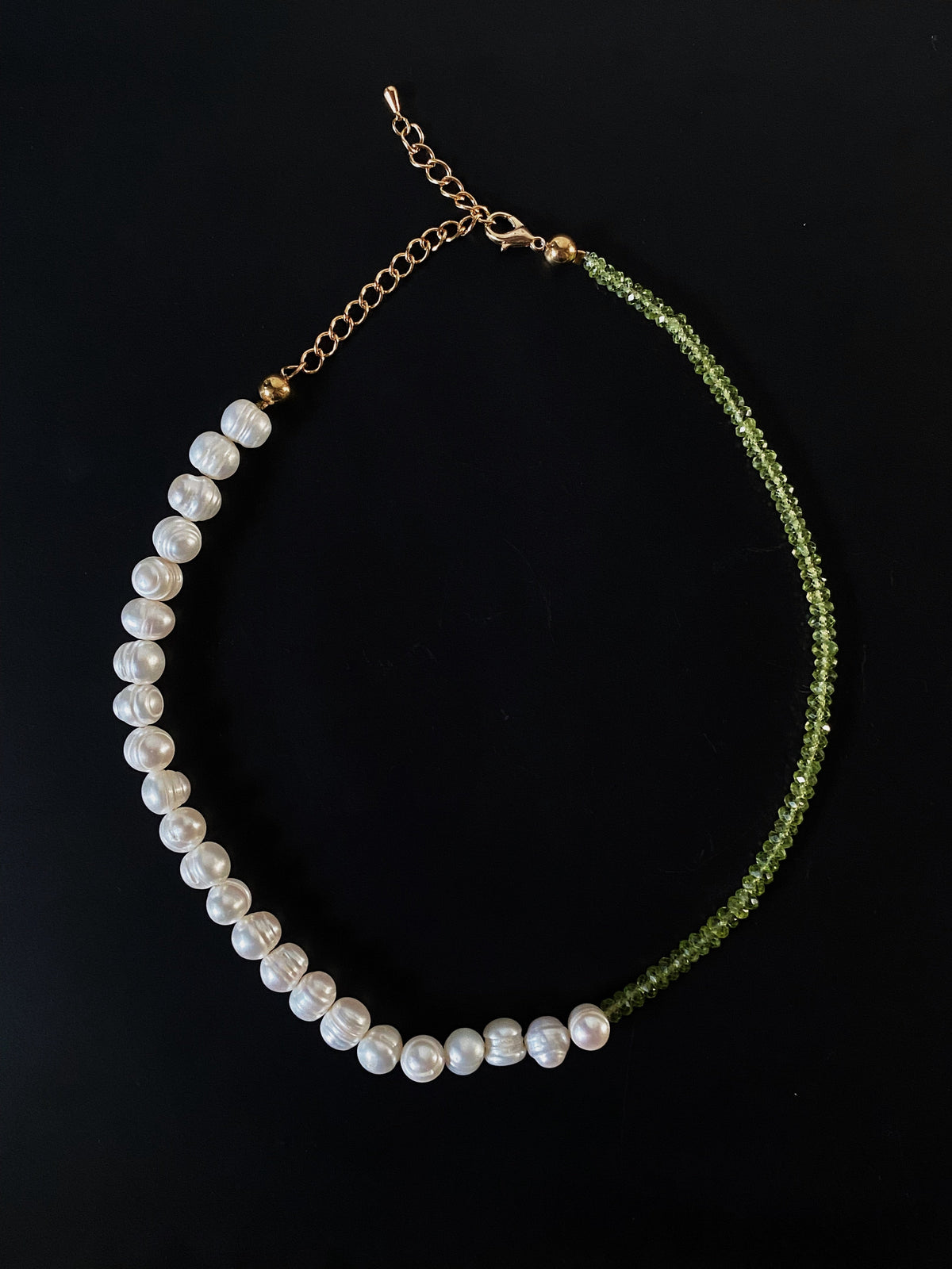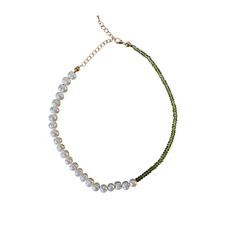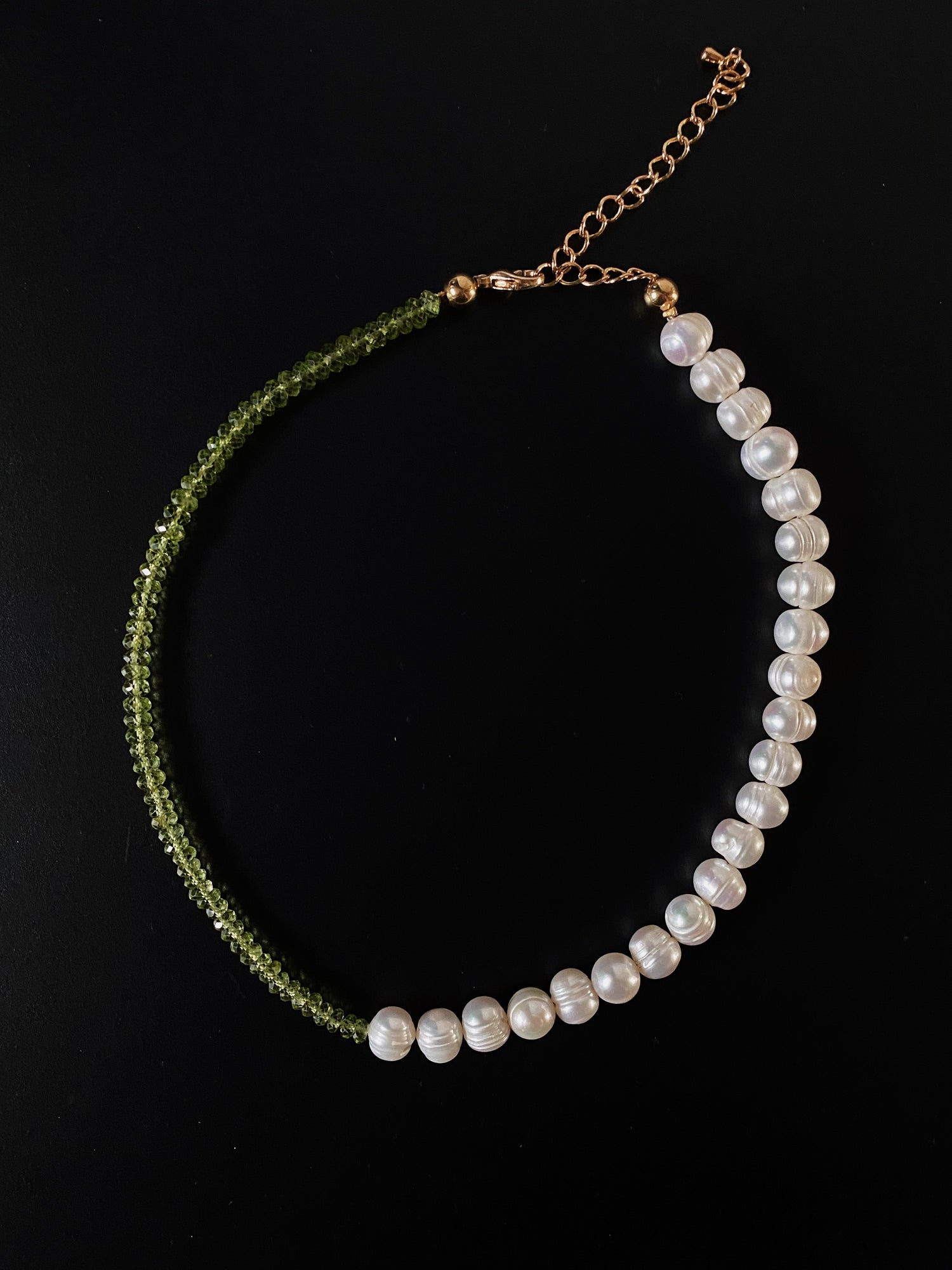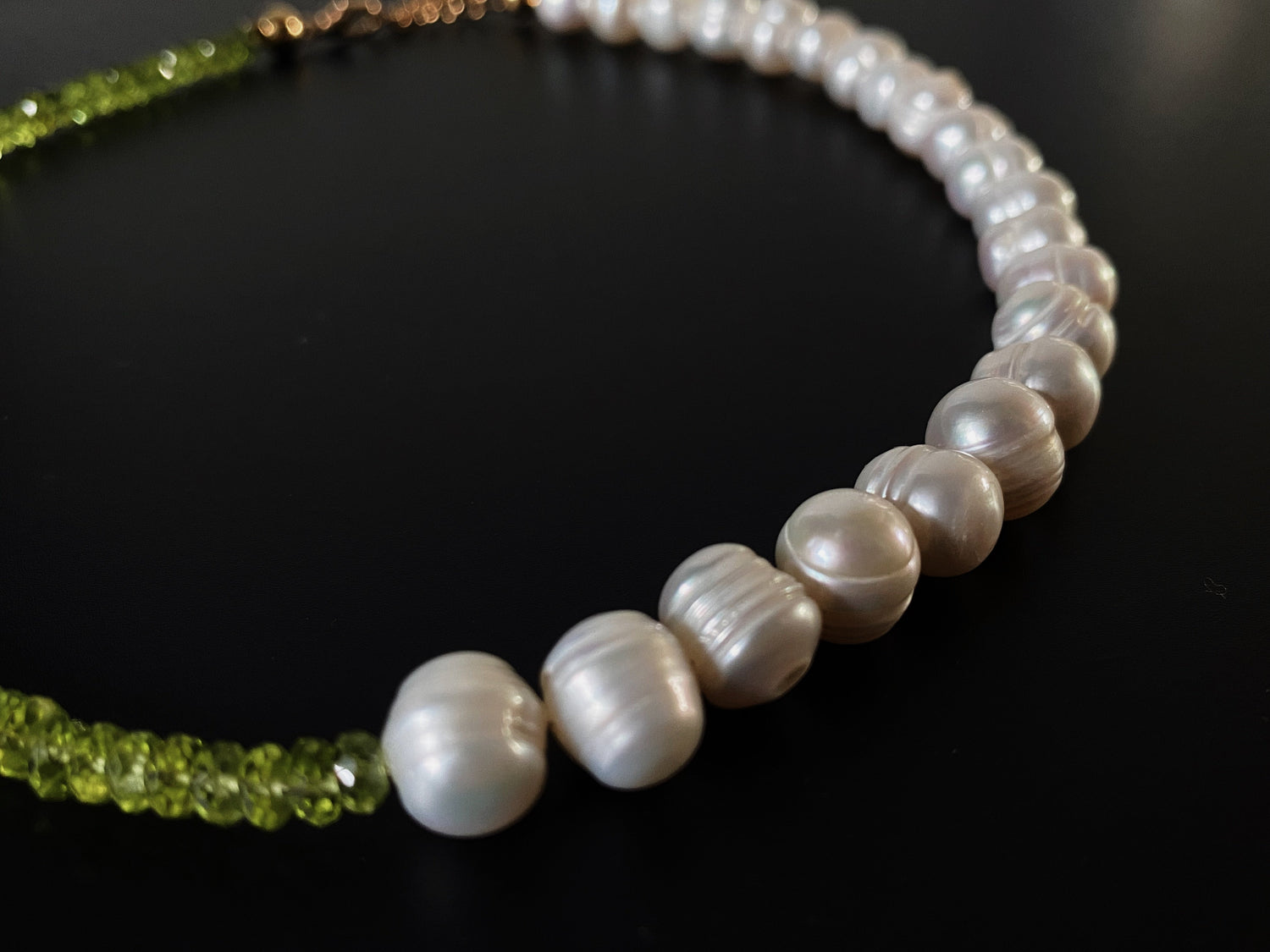 This necklace is made with green peridot and baroque freshwater pearls. It has a gold-plated clasp and chain extension on a brass base.