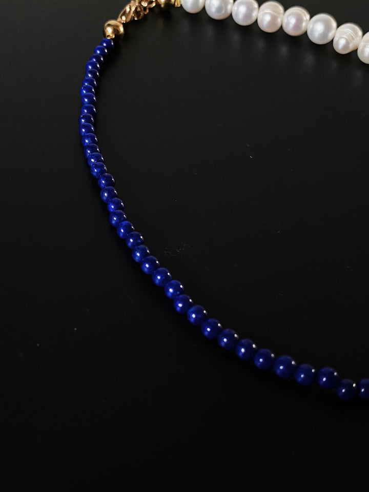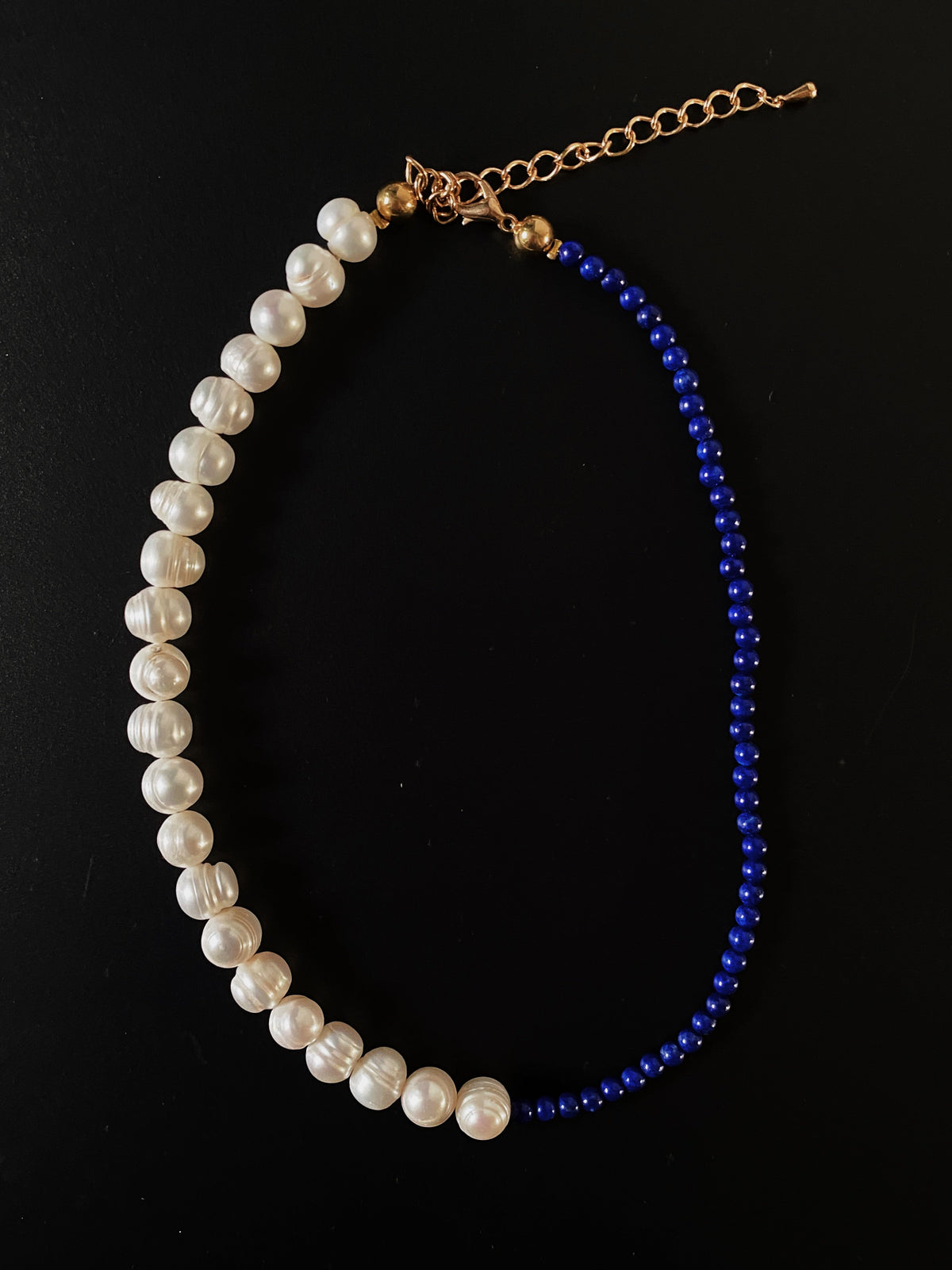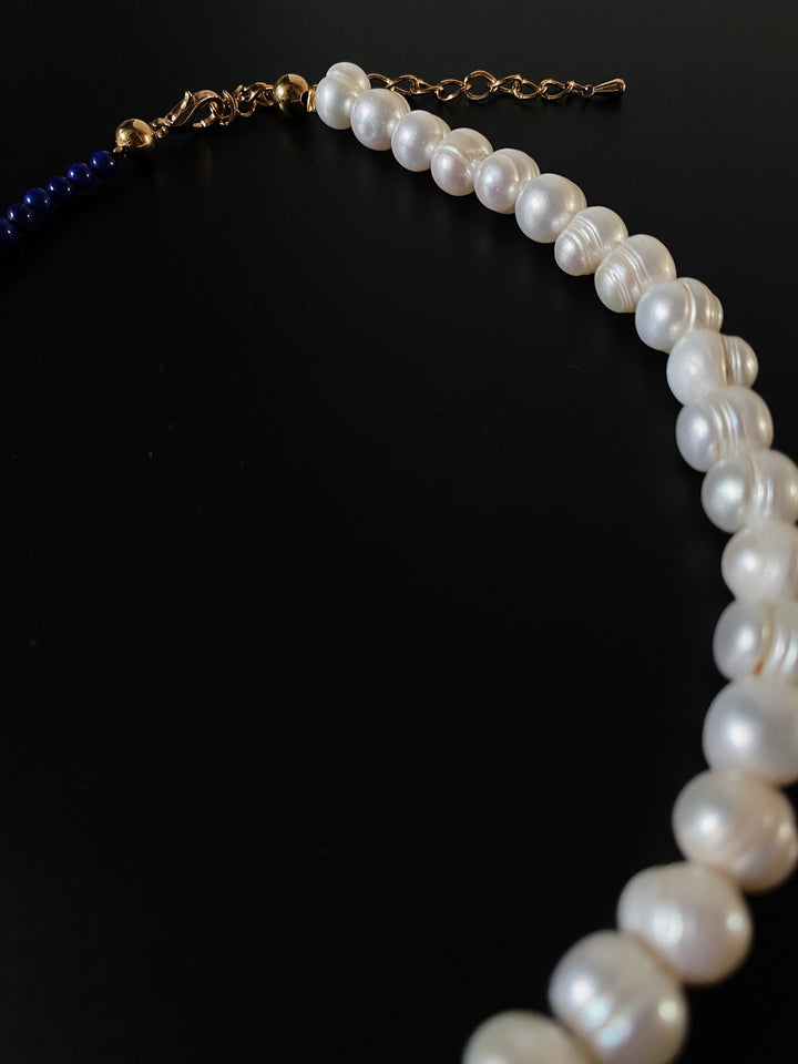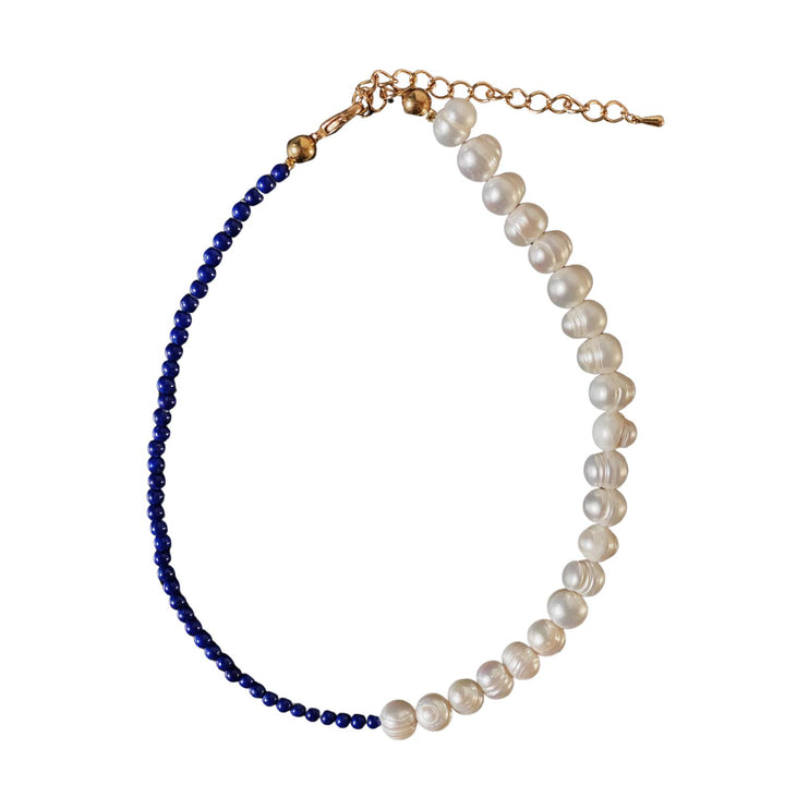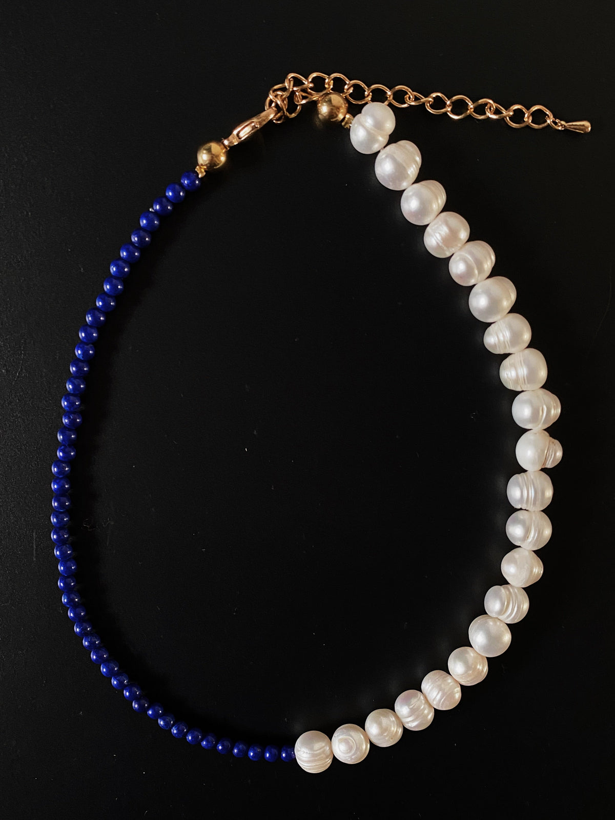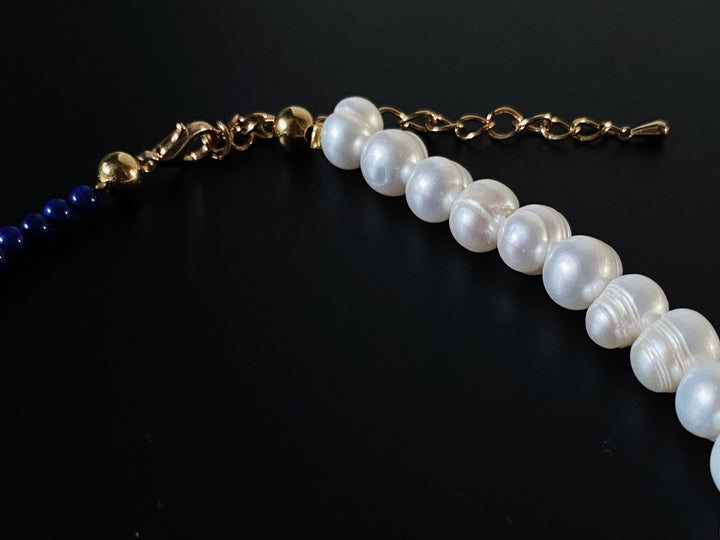 Features electric blue lapis lazuli and baroque freshwater pearls with a gold-plated clasp and chain extension on brass.