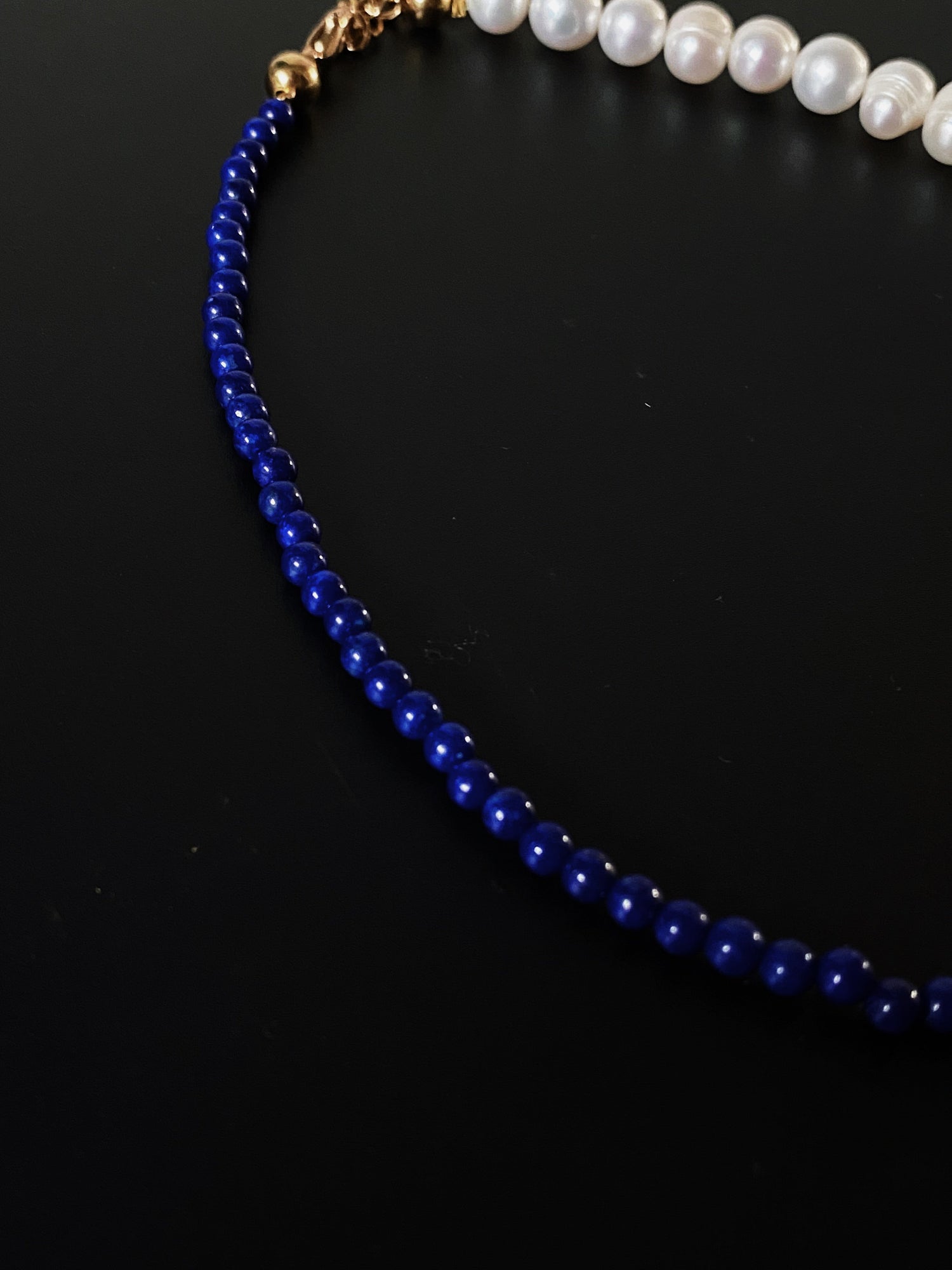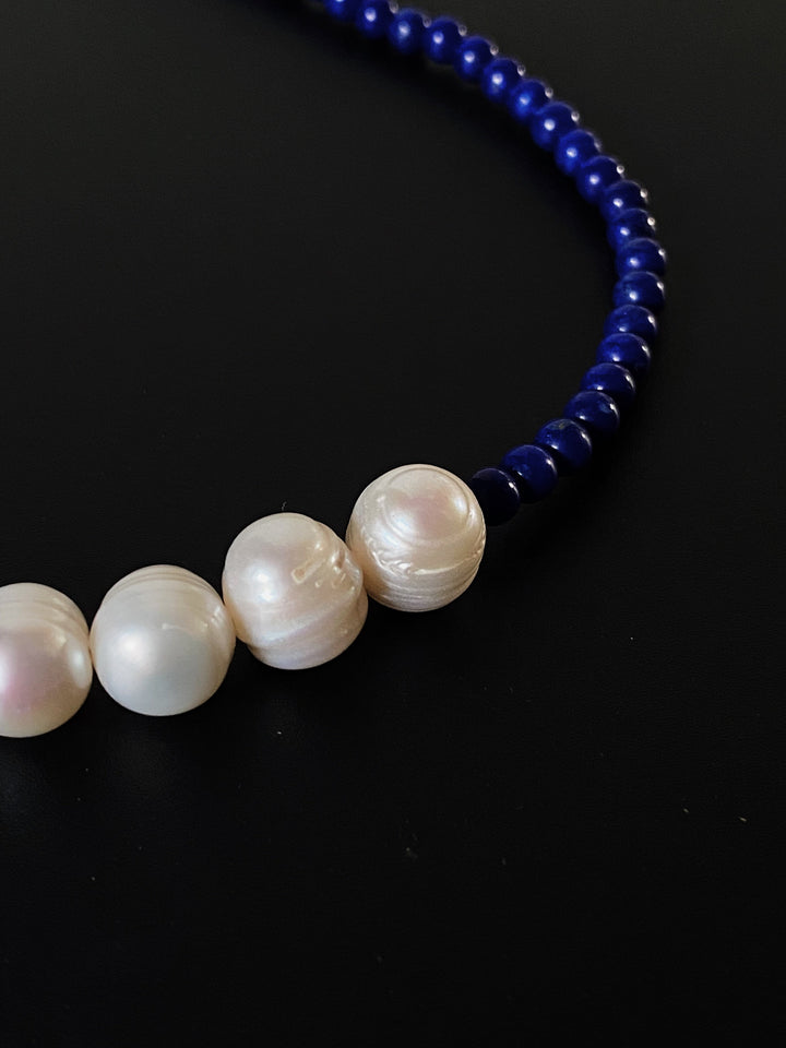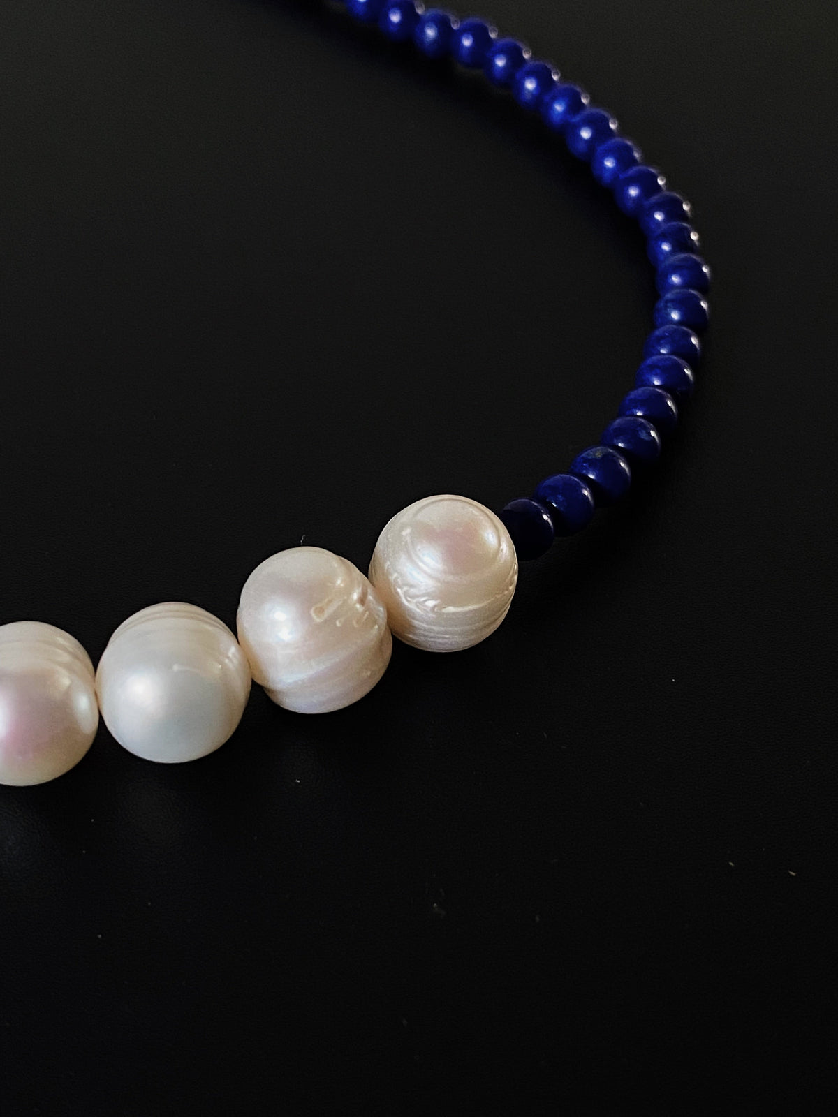 The Lapis Lazuli & Baroque Pearl Necklace by Lemuria Store features a stunning combination of electric blue lapis lazuli and baroque freshwater pearls. The lapis lazuli, a powerful stone, is believed to encourage enlightenment, self-awareness, and harmony, adding a meaningful touch to this beautiful beaded necklace.