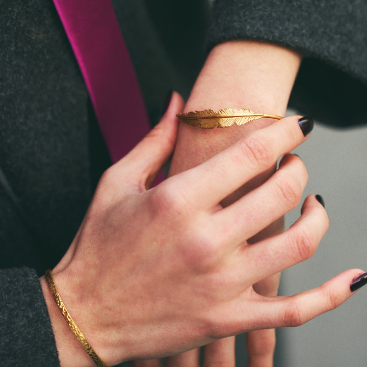 The Golden Laurel Cuff Bracelet by Les Reines is a luxurious and empowering accessory. This 24K gold-plated cuff is shaped like a delicate leaf, infused with rich heritage and artistry. Wearing it is meant to evoke a sense of triumph and victory, as if you are wearing a crown of laurel leaves.