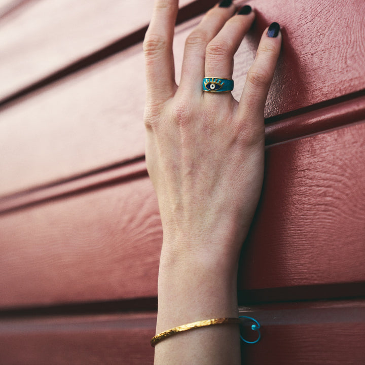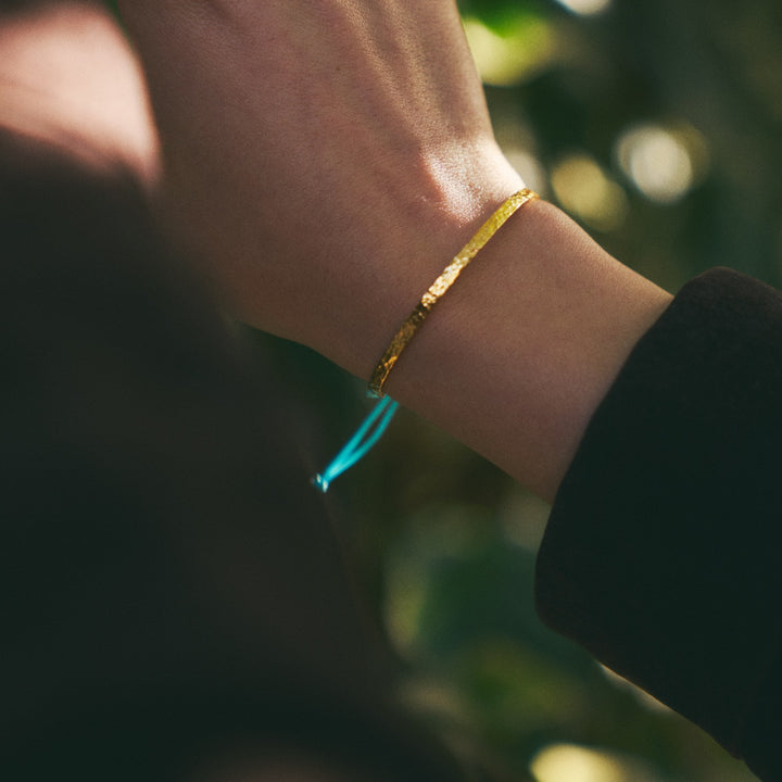 The Turquoise Elegance Hammered Bracelet by Les Reines is a minimal and elegant bangle. The 24K gold-plated and hammered surface adds a touch of texture, while the turquoise rope infuses the piece with the tranquility of dark turquoise waters. It’s a sophisticated accessory that draws inspiration from the subtle beauty of nature.