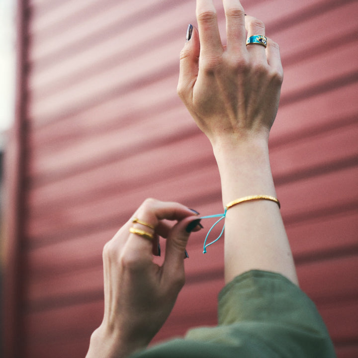This bracelet is made with a 24K gold-plated and hammered brass base, with a turquoise rope.