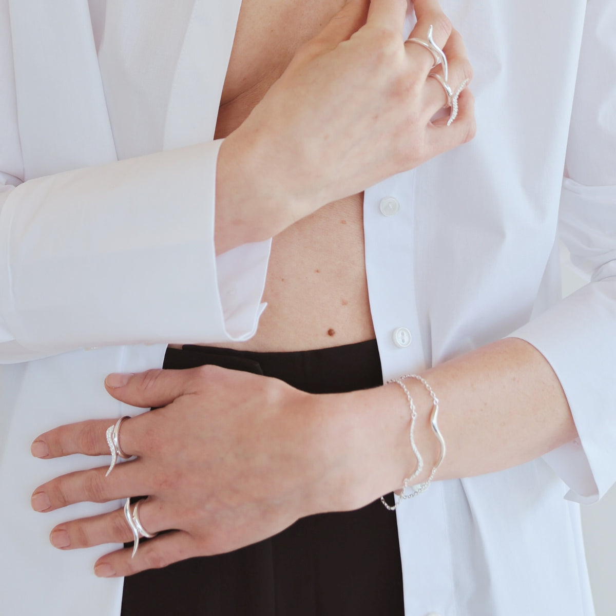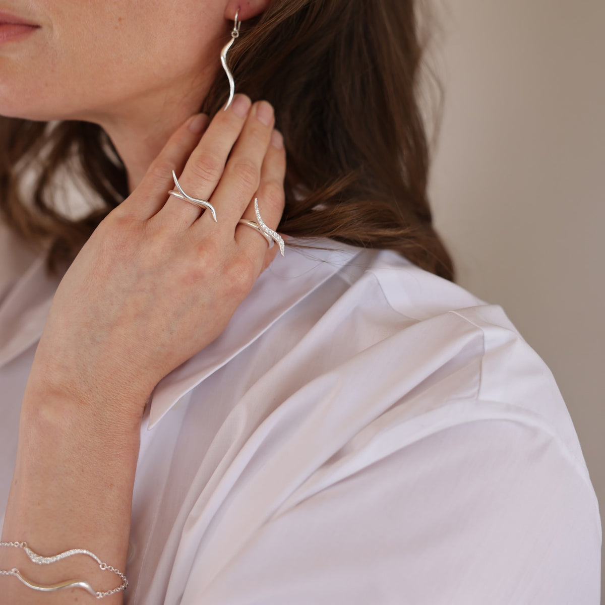 This Swirl Bracelet by Linda Fiore is a luxurious accessory with a minimalist Nordic-inspired design. It features a graceful swirl pattern adorned with a stunning ensemble of clear CZ crystals set in sterling silver. The bracelet is designed for versatility, perfect for wearing alone for understated elegance or for layering to create a bolder statement. It is crafted from a minimum of 50% recycled materials.
