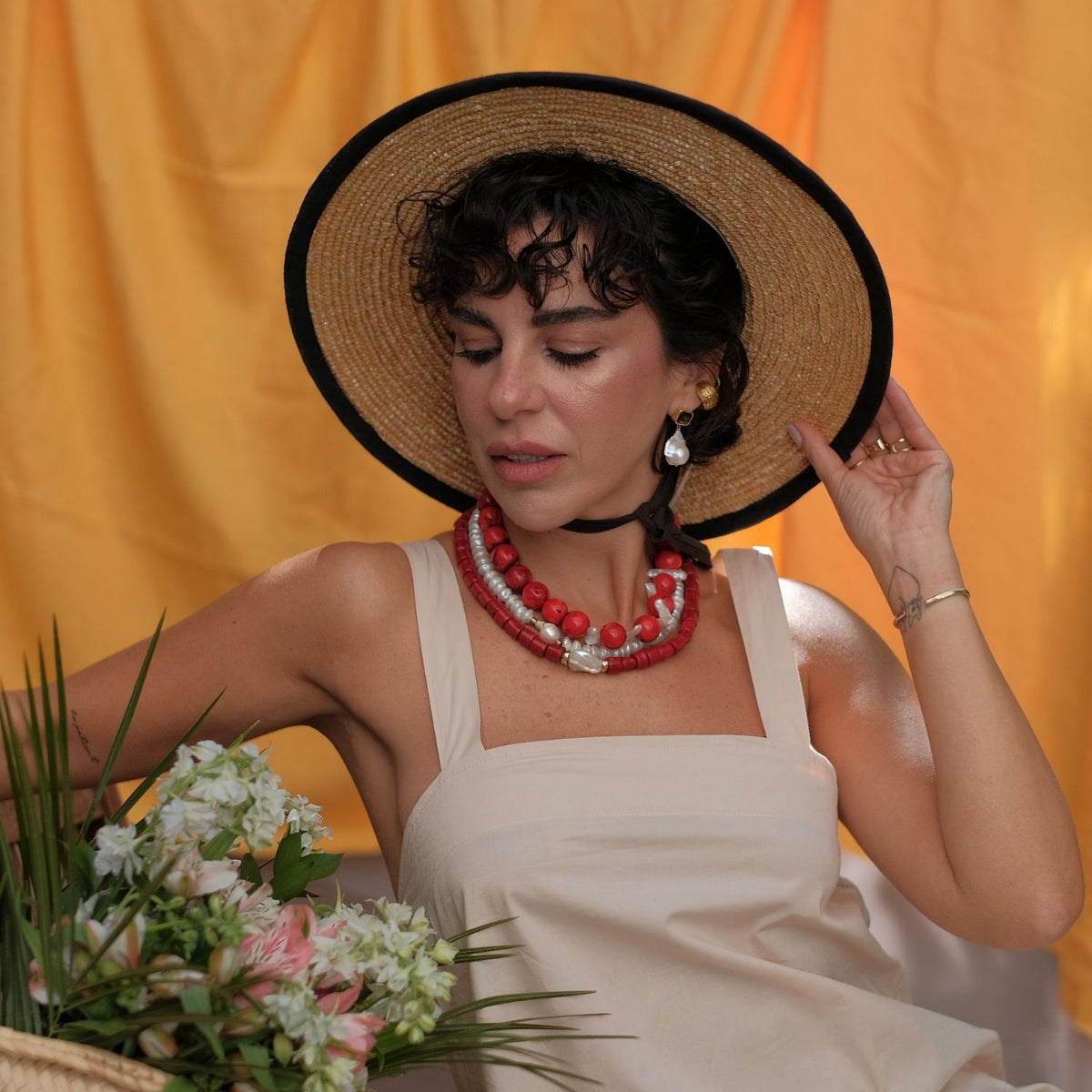 This Harmonia Baroque Pearl Red Coral Necklace by Linya Jewellery is a unique design that evokes the elegant atmosphere of the beach. It features a careful line of burgundy red coral stones with a natural baroque pearl at the center. This piece is the perfect complement to hot summer days, making it ideal for beach outings and special invitations, blending natural beauty with sophisticated style.