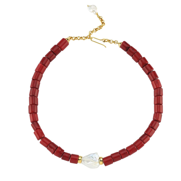 This necklace is a unique design made of 925 sterling silver with 22k gold plating, and features natural red coral stones and a baroque pearl.